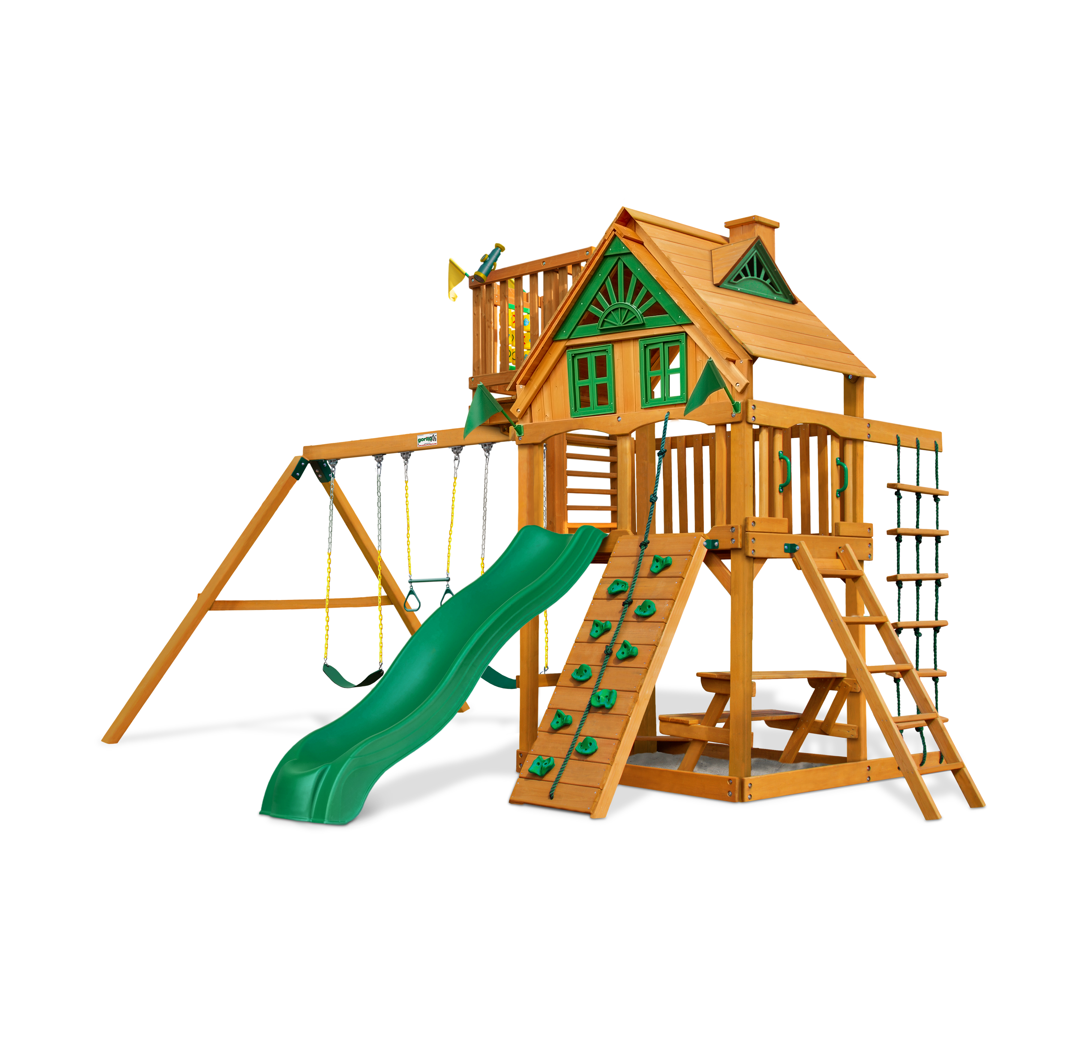 • Clubhouse & Extras: Includes a built-in picnic table, sandbox area, tic-tac-toe panel, steering wheel, and play telescope