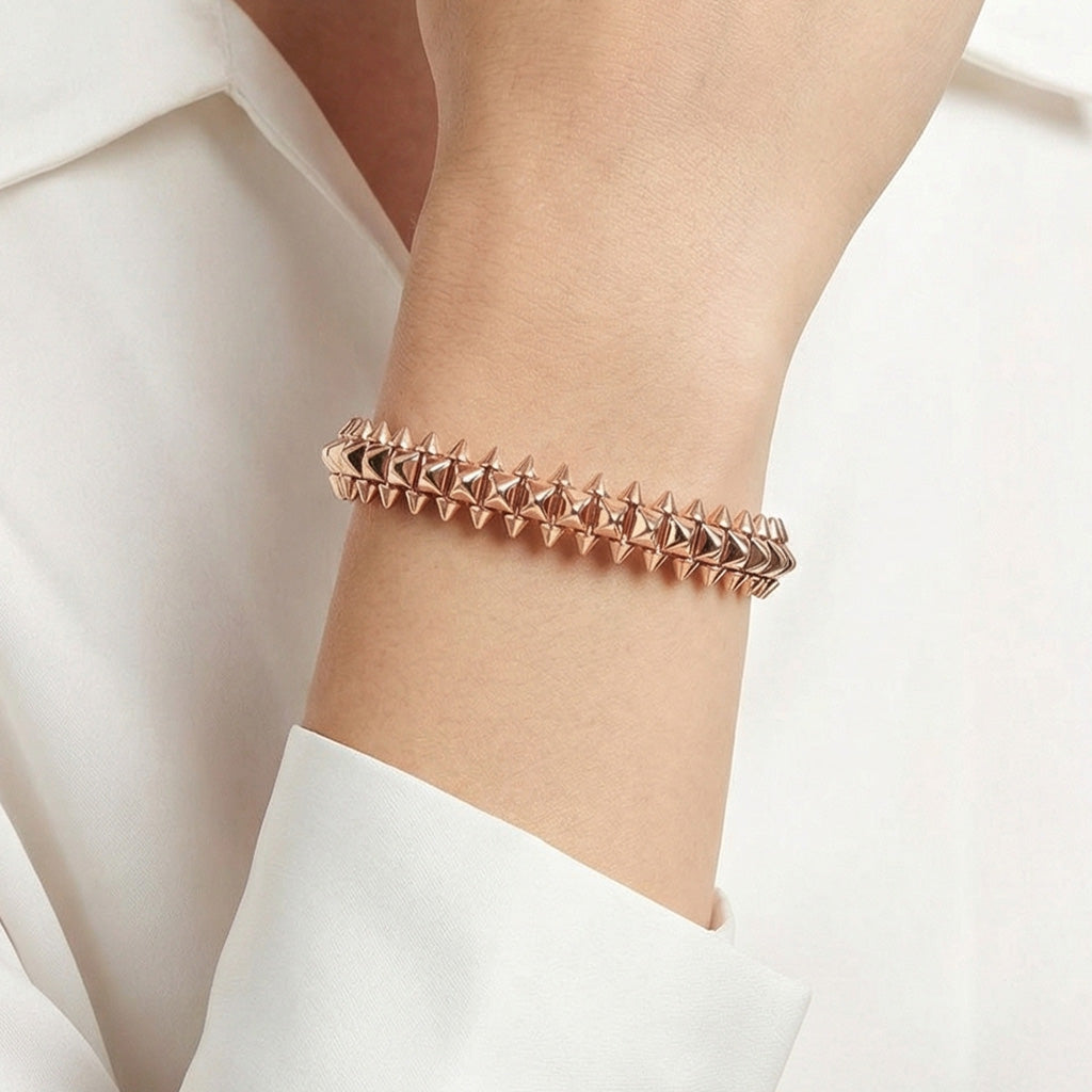 A striking double-row geometric stud pattern introduces edge and attitude while maintaining a sleek, elegant silhouette. With an adjustable fit for wrists measuring 16–18 cm, it’s designed for everyday versatility and elevated styling.