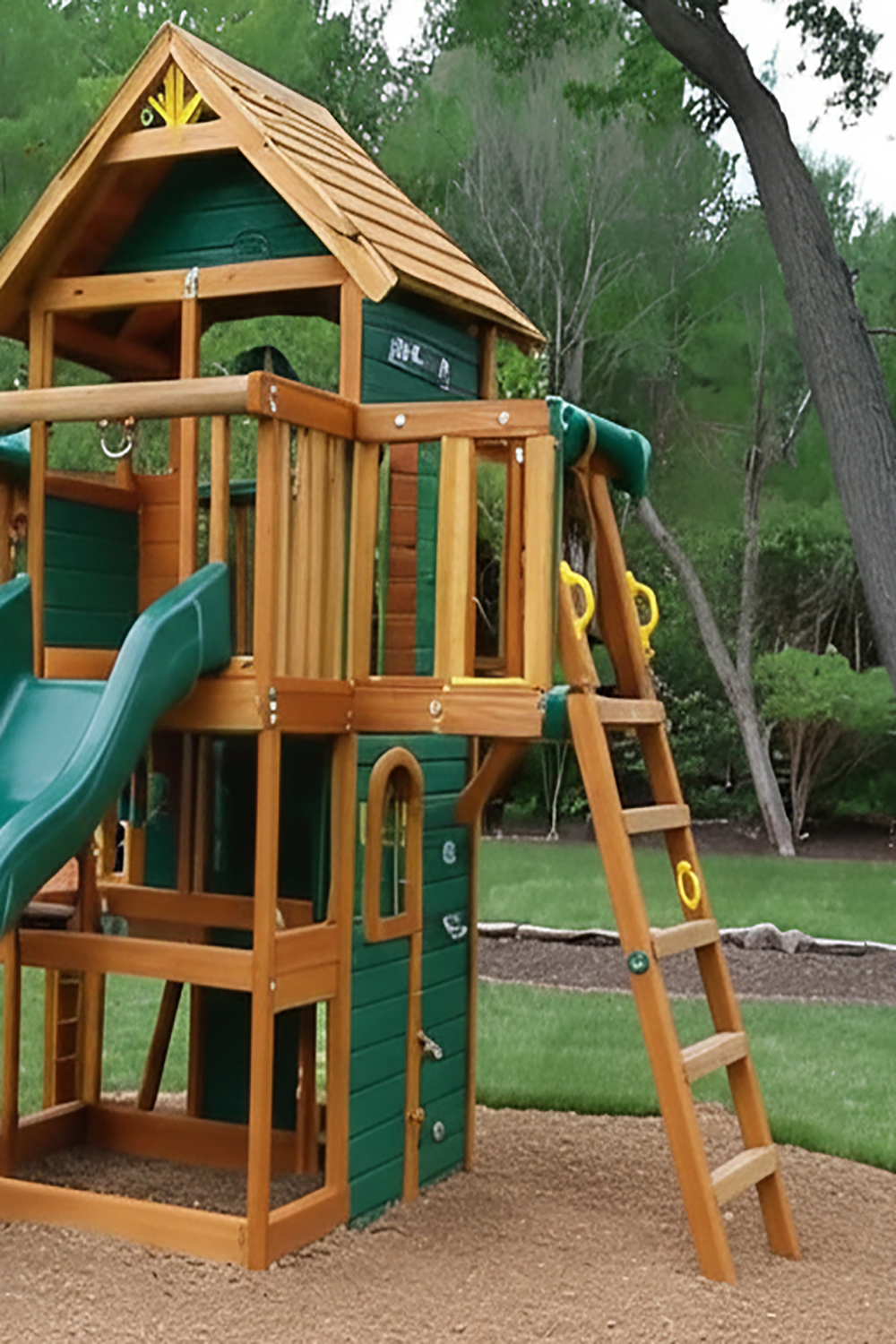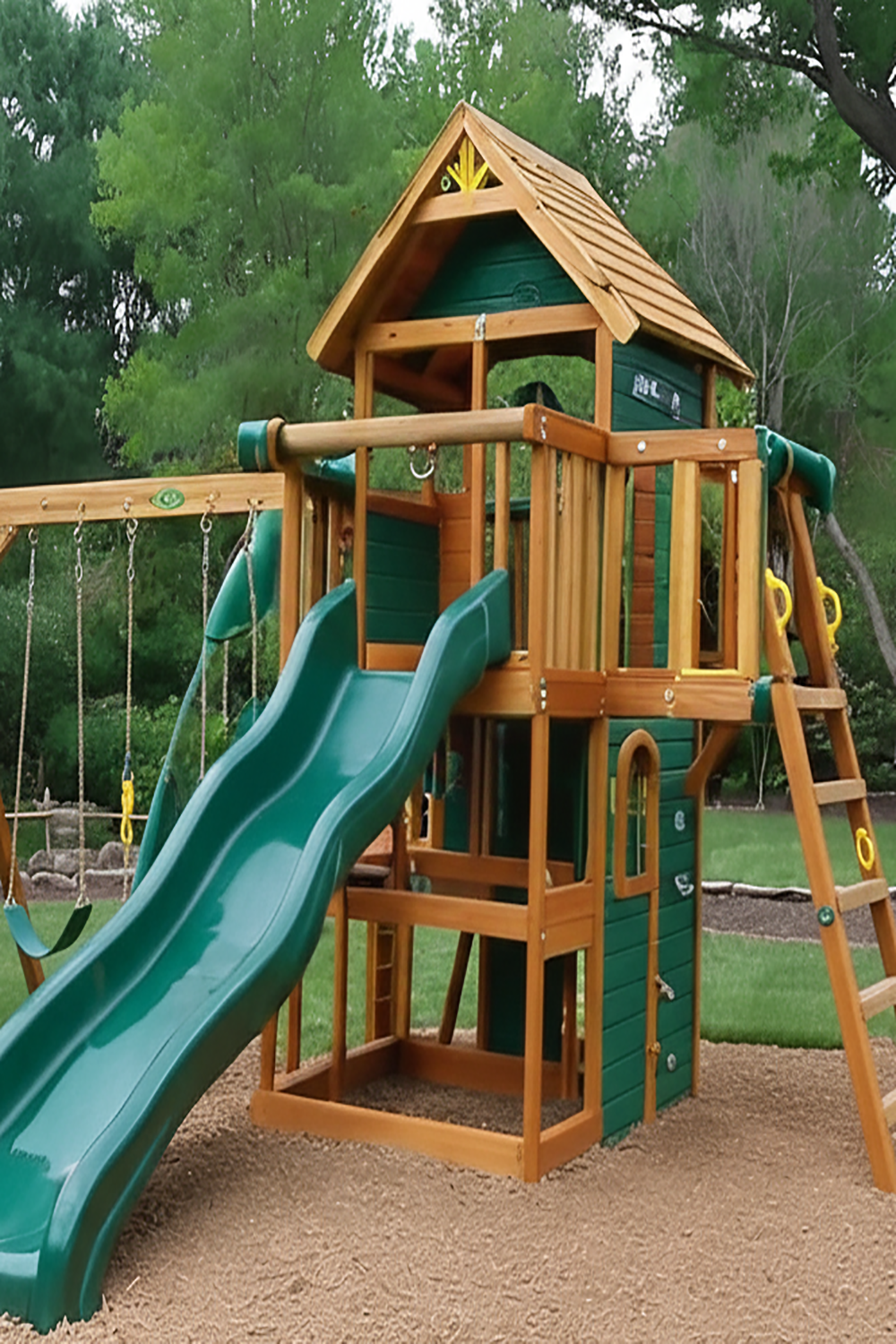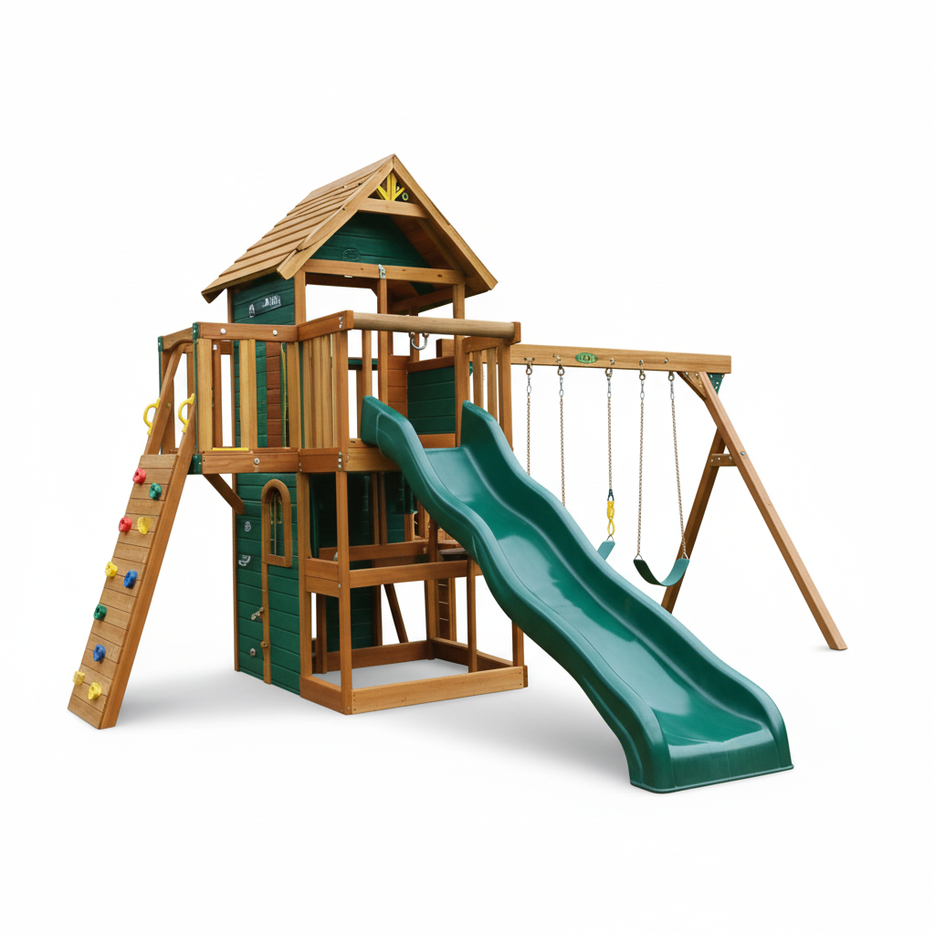 Bring excitement and adventure into your backyard with the Compact Wooden Playset. Designed with a two-story playhouse, dual slides, swings, and multiple climbing options, this all-in-one structure offers endless fun in a smaller footprint. Perfect for families looking to maximize outdoor play while saving space, it blends safety, style, and durability into one engaging playground.