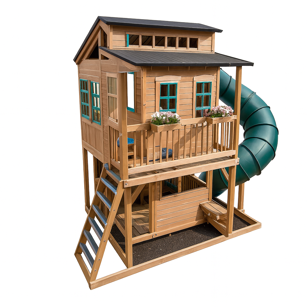 Give your kids a magical backyard retreat with the Deluxe Cedar Wood Playhouse. Featuring a two-story tower with balcony, flower boxes, and windows, this playset feels like a real home scaled for children. Add in a thrilling spiral tube slide and spacious lower-level clubhouse, and you’ve got the perfect blend of imaginative role-play and active outdoor fun.
