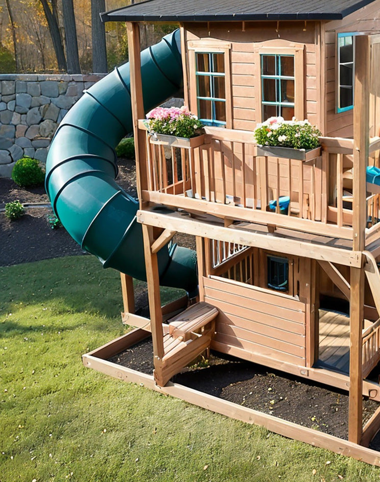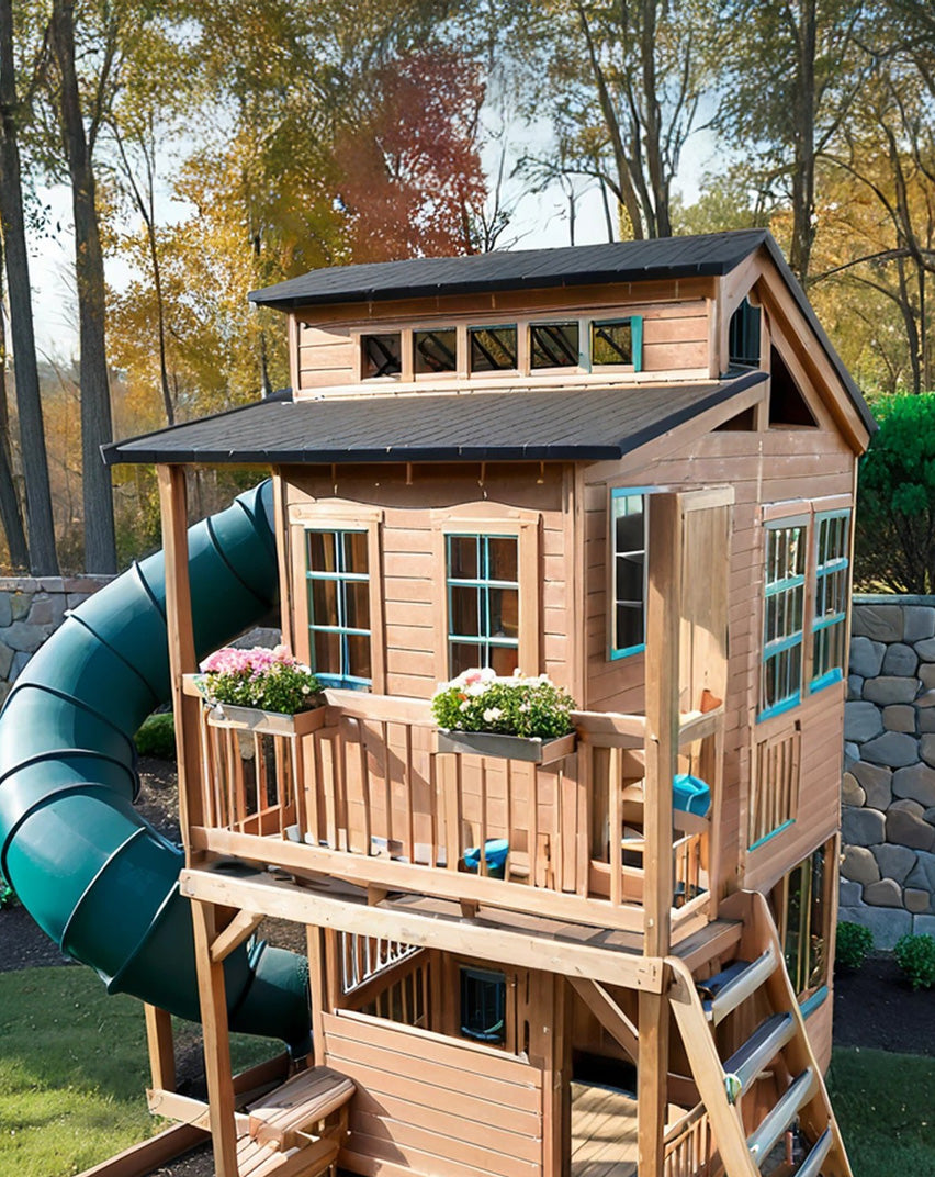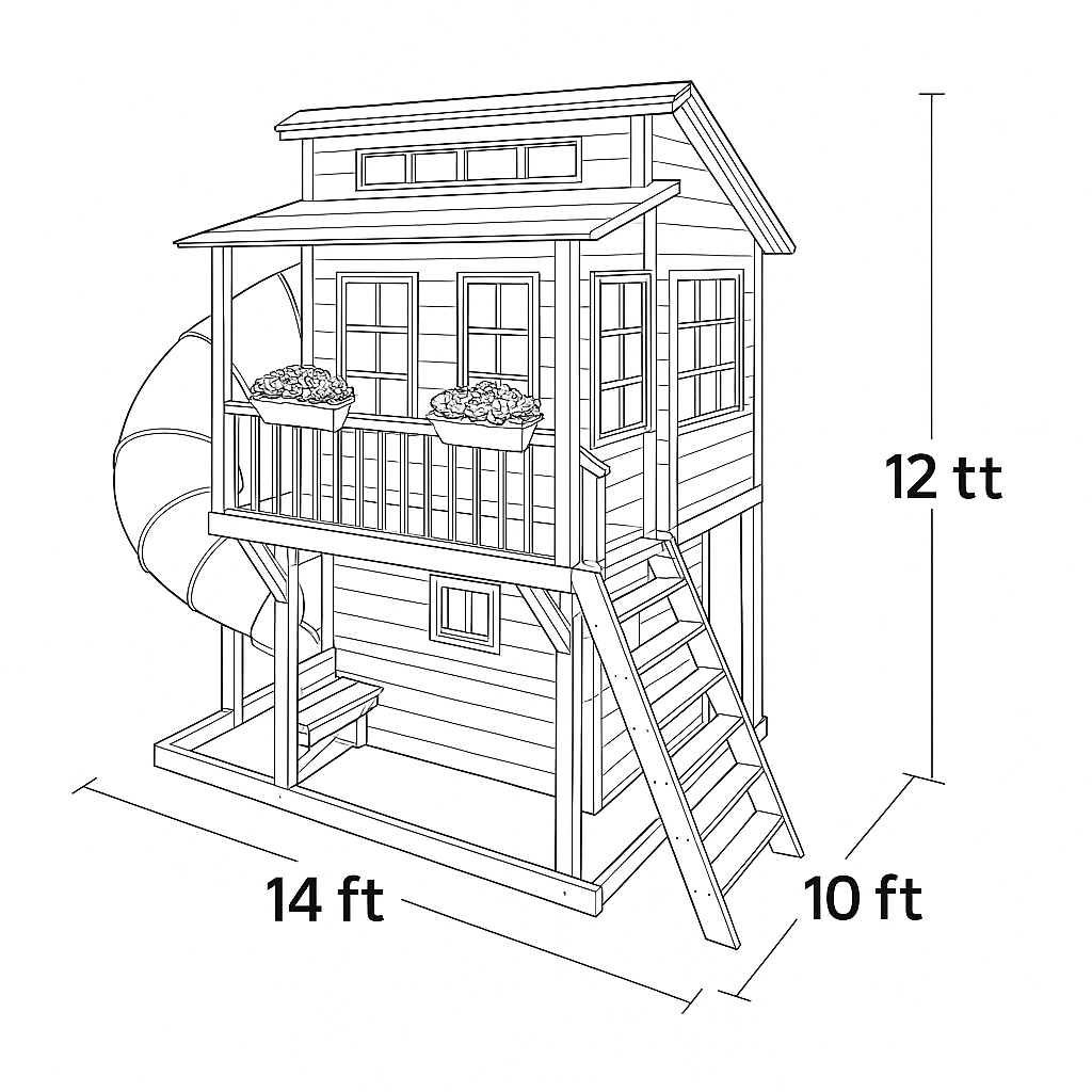 - Play Features: Two-story tower, spiral slide, balcony, flower boxes, clubhouse