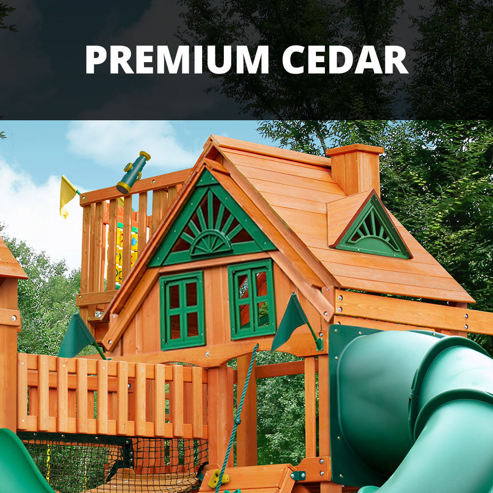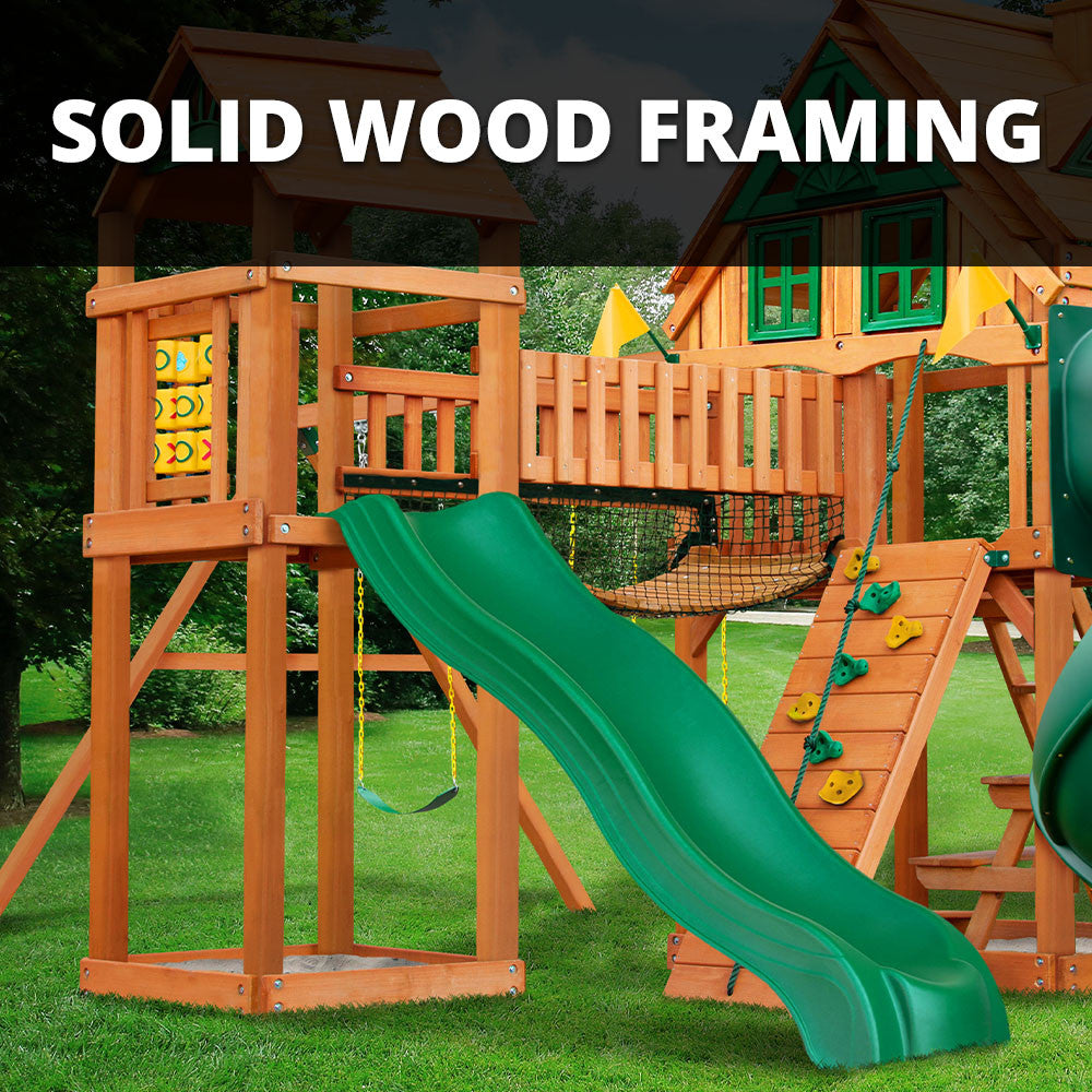 Deluxe Cedar Wooden Swing Set with Double Slides, Rock Wall & Playhouse