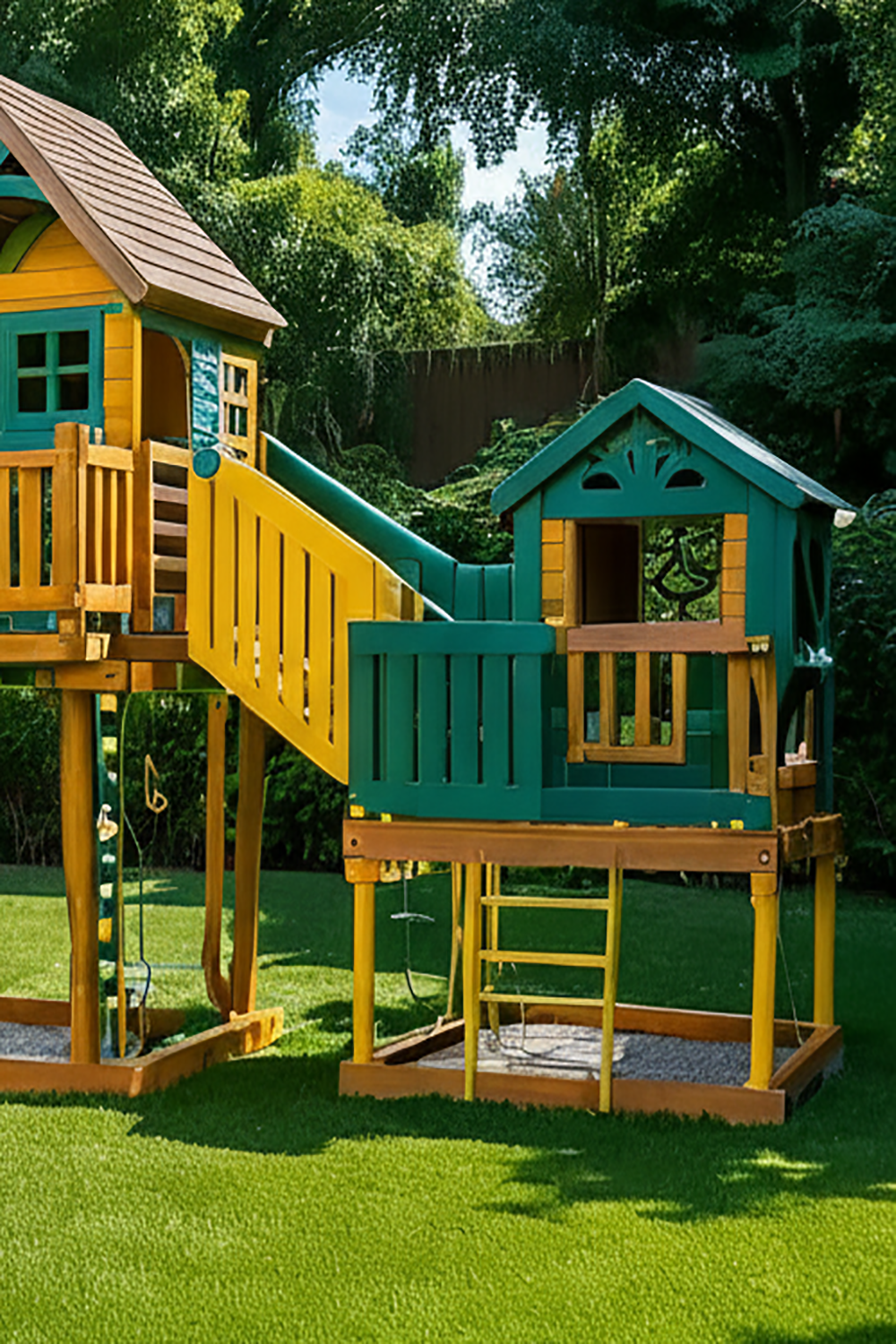 - Multi-Level Playhouses – Two connected playhouses with windows, balcony, and shaded areas.