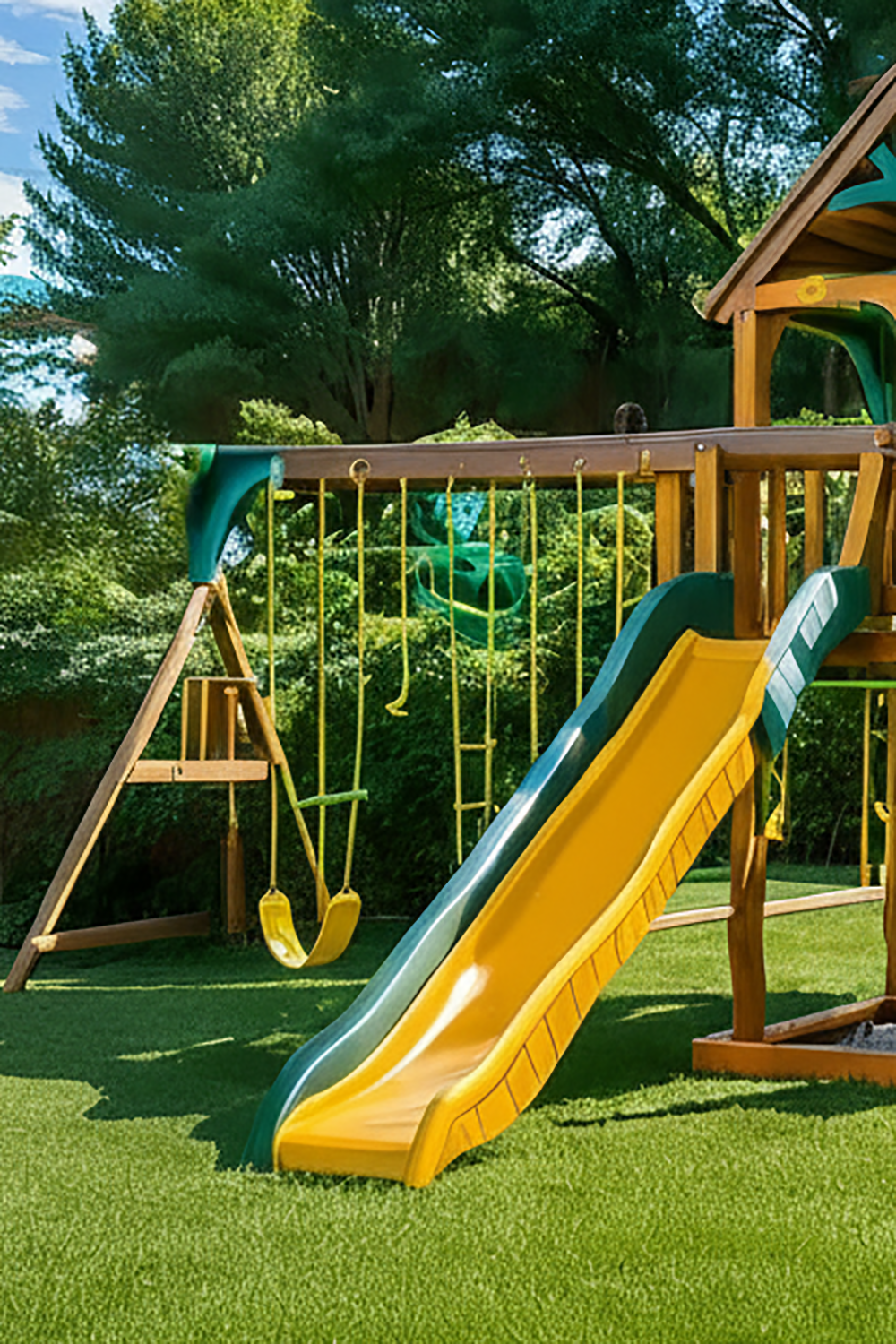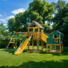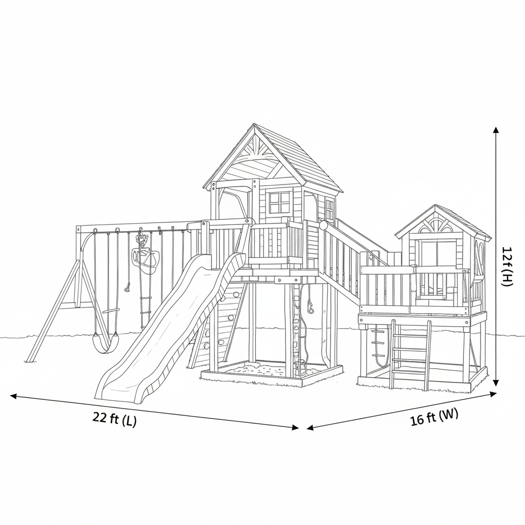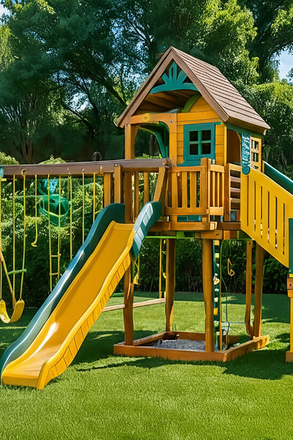 - Style: Backyard playground with natural wood + color accents