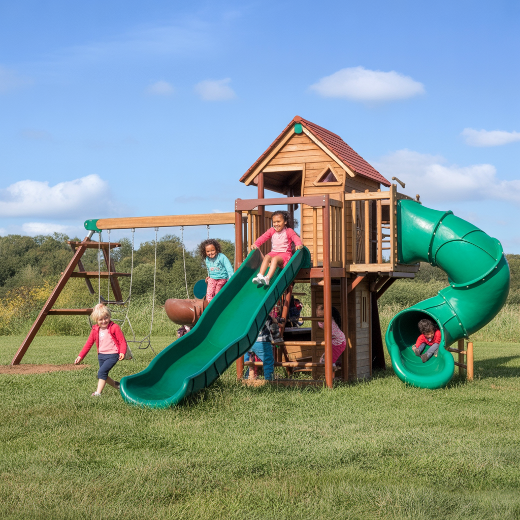 Deluxe Wooden Swing Set with Double Slides, Tube Slide & Backyard Playhouse