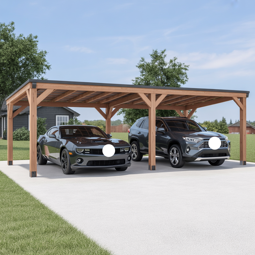 Double Wooden Carport – 2-Car Shelter with Flat Roof, Outdoor Driveway Cover
