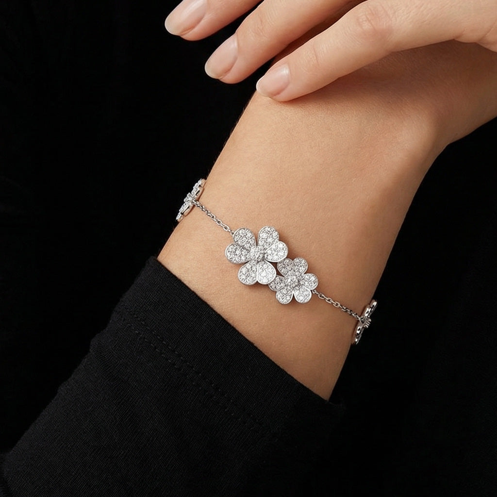 Delicate and radiant, the Frivole 5 Flowers Clover Bracelet celebrates timeless elegance through the graceful form of blooming florals. Inspired by nature’s lightness, five clover-shaped flower motifs shimmer with high‑grade cubic zirconia (CZ) accents, offering a refined sparkle from every angle.