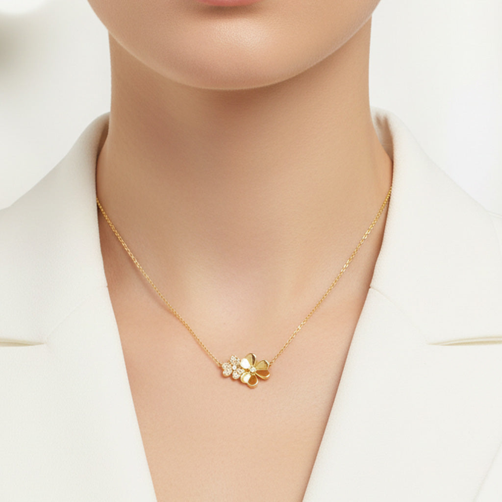 The Frivole Clover Necklace captures the delicate essence of nature with its graceful dual-flower design. Featuring two overlapping clover blooms, this piece symbolizes joy and renewal, radiating timeless femininity with every subtle shimmer.