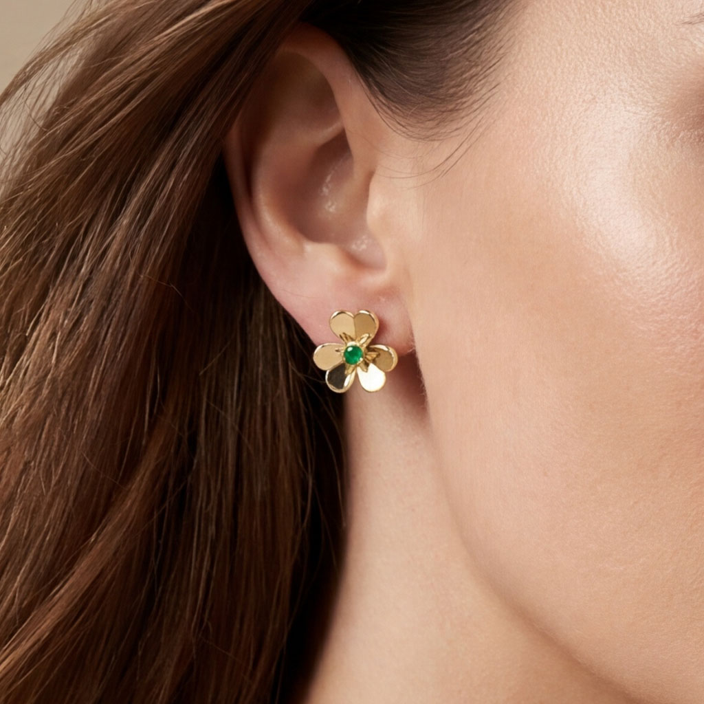 Crafted from 925 sterling silver and finished in 18K yellow gold vermeil, each earring features a five-petal flower design centered with a vibrant green cubic zirconia (CZ) stone — offering a refined pop of color while maintaining clarity in gemstone labeling.