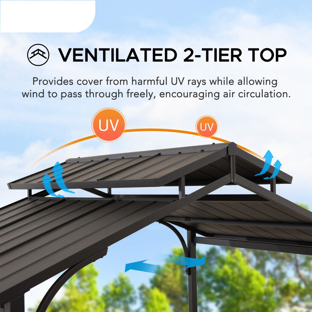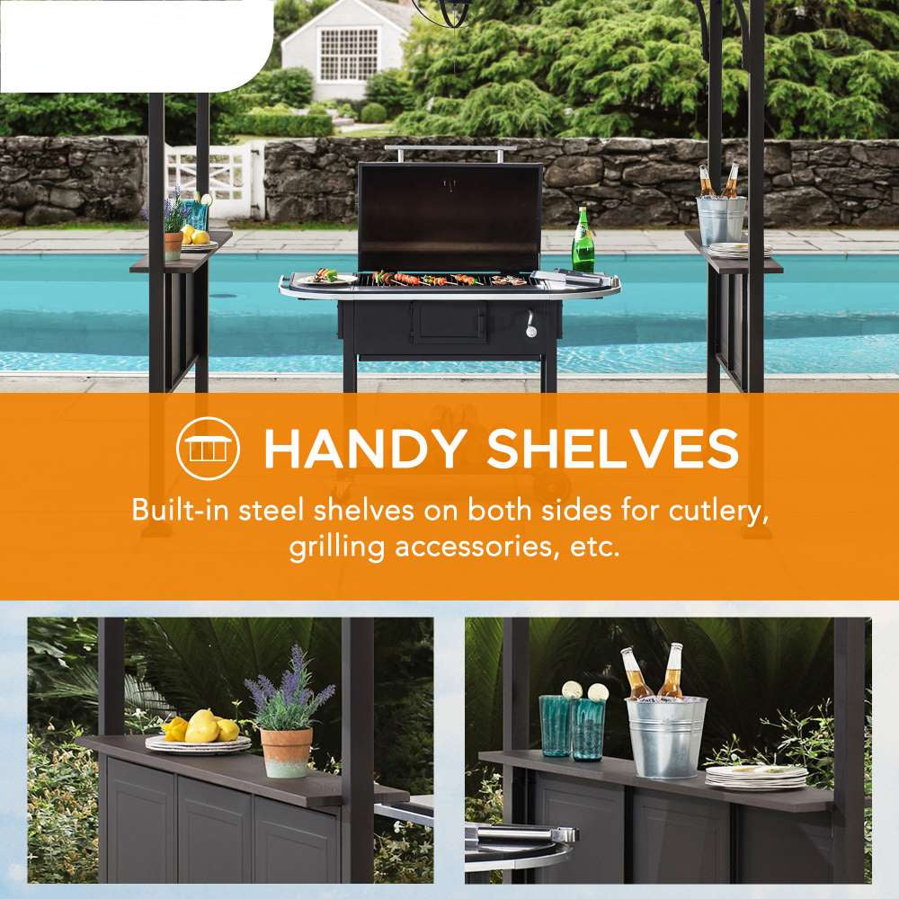 Durable grill gazebo with vented steel roof and side shelves, designed to provide shade, airflow, and convenience for outdoor cooking and BBQs.