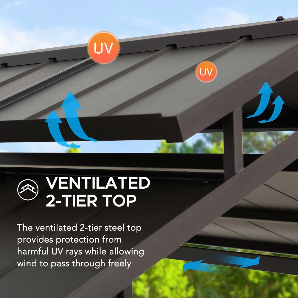 Enhance your outdoor cooking experience with the Hardtop Grill Gazebo, designed with a ventilated double roof and heavy-duty steel frame. Featuring convenient side shelves, this gazebo creates a shaded and functional grilling station for your backyard or patio.