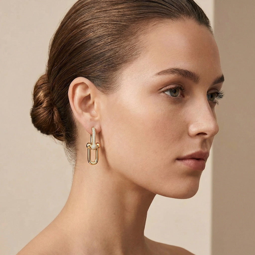 Expertly crafted from 925 sterling silver and finished in 18K yellow gold vermeil, they deliver a radiant finish designed to last. Inspired by modern industrial design, this pair makes a confident statement—perfect for fashion-forward looks.