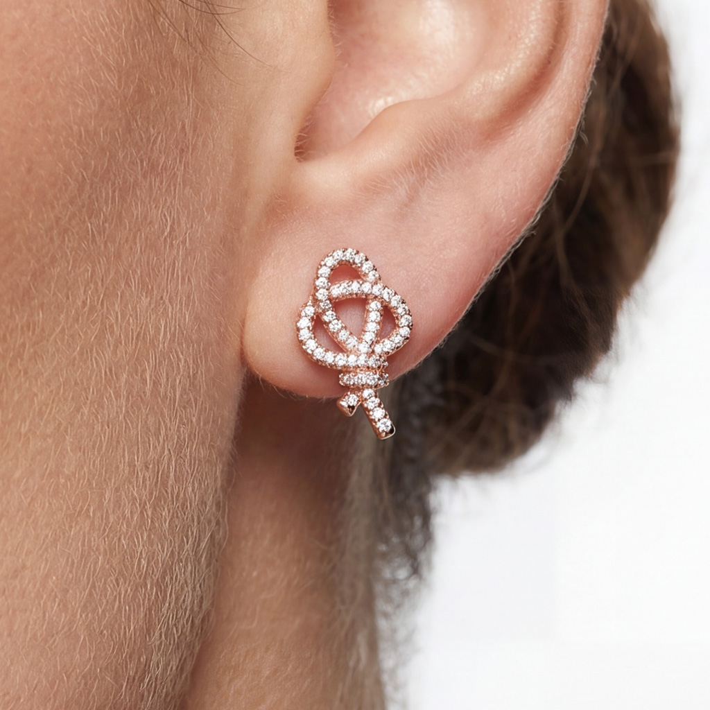 Intricate woven loops form a key‑inspired silhouette, adorned with sparkling cubic zirconia stones that catch the light beautifully.