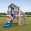 Create magical outdoor adventures with this elevated kids playhouse in a charming blue-and-white design. With its balcony, windows, climbing ladder, and fun blue slide, this playhouse encourages active play, imagination, and social interaction.