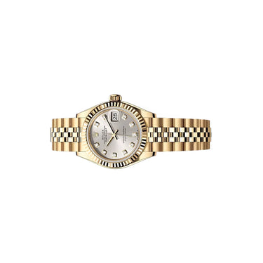 This women’s automatic watch features a 28mm case crafted from 925 sterling silver with 18K yellow gold plating, paired with a Jubilee bracelet made of five-piece links for a secure and comfortable fit. The silver dial is designed with CZ-set hour markers, offering clear legibility and refined detailing. A date window with magnifier is positioned at 3 o’clock for everyday calendar viewing.