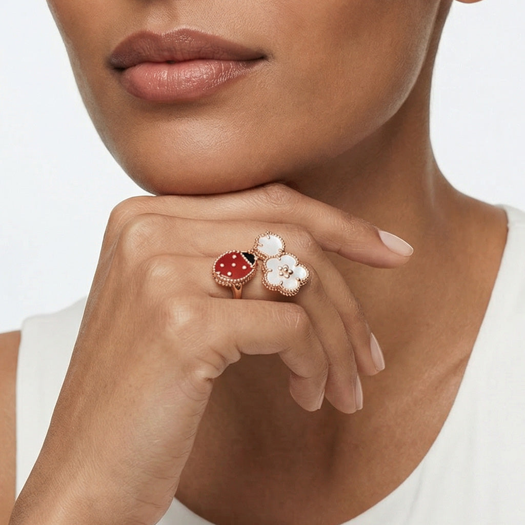 Expertly crafted from 925 sterling silver and finished in 18K rose gold vermeil, this ring offers a luxurious shine and everyday durability. Its distinctive open silhouette features floral and ladybug motifs, symbolizing luck, vitality, and renewal—making it more than an accessory, but a thoughtful expression of nature-inspired charm.