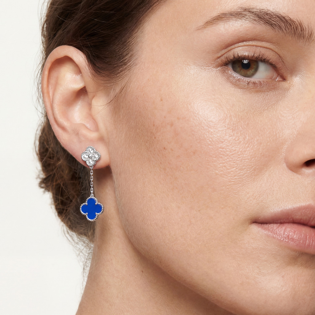 The upper floral motif is pavé-set with cubic zirconia (CZ) stones, delivering brilliant sparkle. Suspended below, a vibrant blue agate clover-shaped charm sways gently from a fine chain, creating graceful movement and a striking contrast in texture and tone.