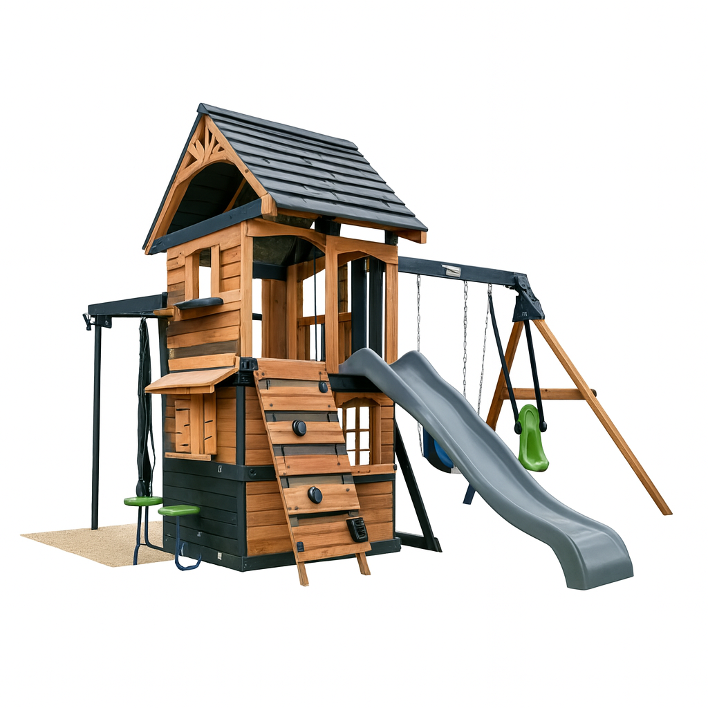 Bring modern design and playful fun to your backyard with the Modern Cedar Wood Playset. This compact yet feature-packed playground includes a wave slide, swings, climbing wall, and a built-in snack stand for imaginative play. Crafted with cedar wood and steel reinforcements, it’s the perfect balance of durability, style, and fun for families with limited outdoor space.