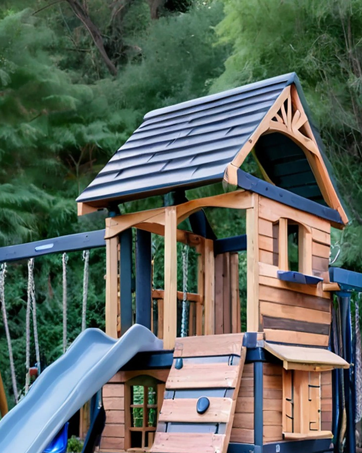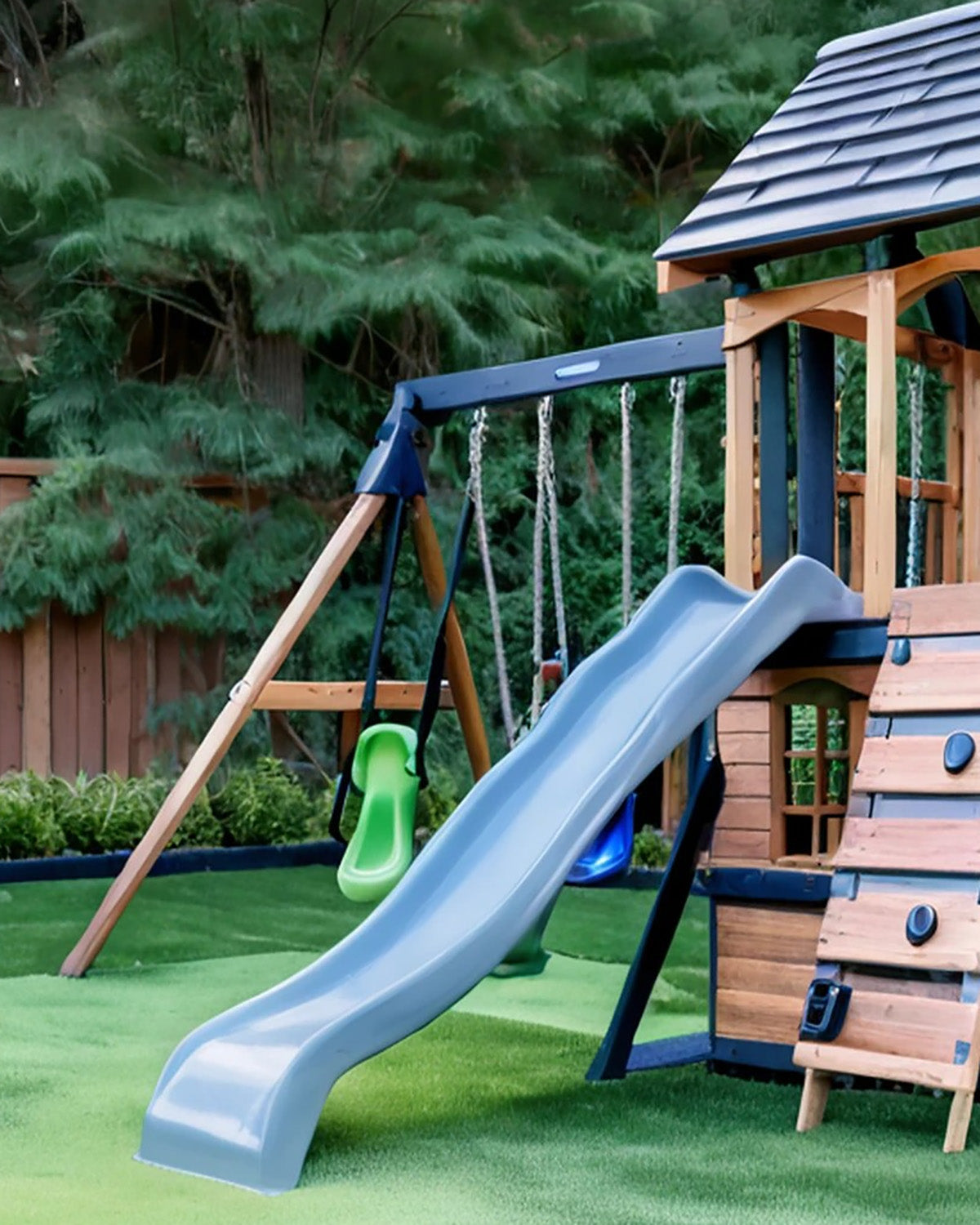 - Material: Cedar wood frame + reinforced steel joints + plastic slide