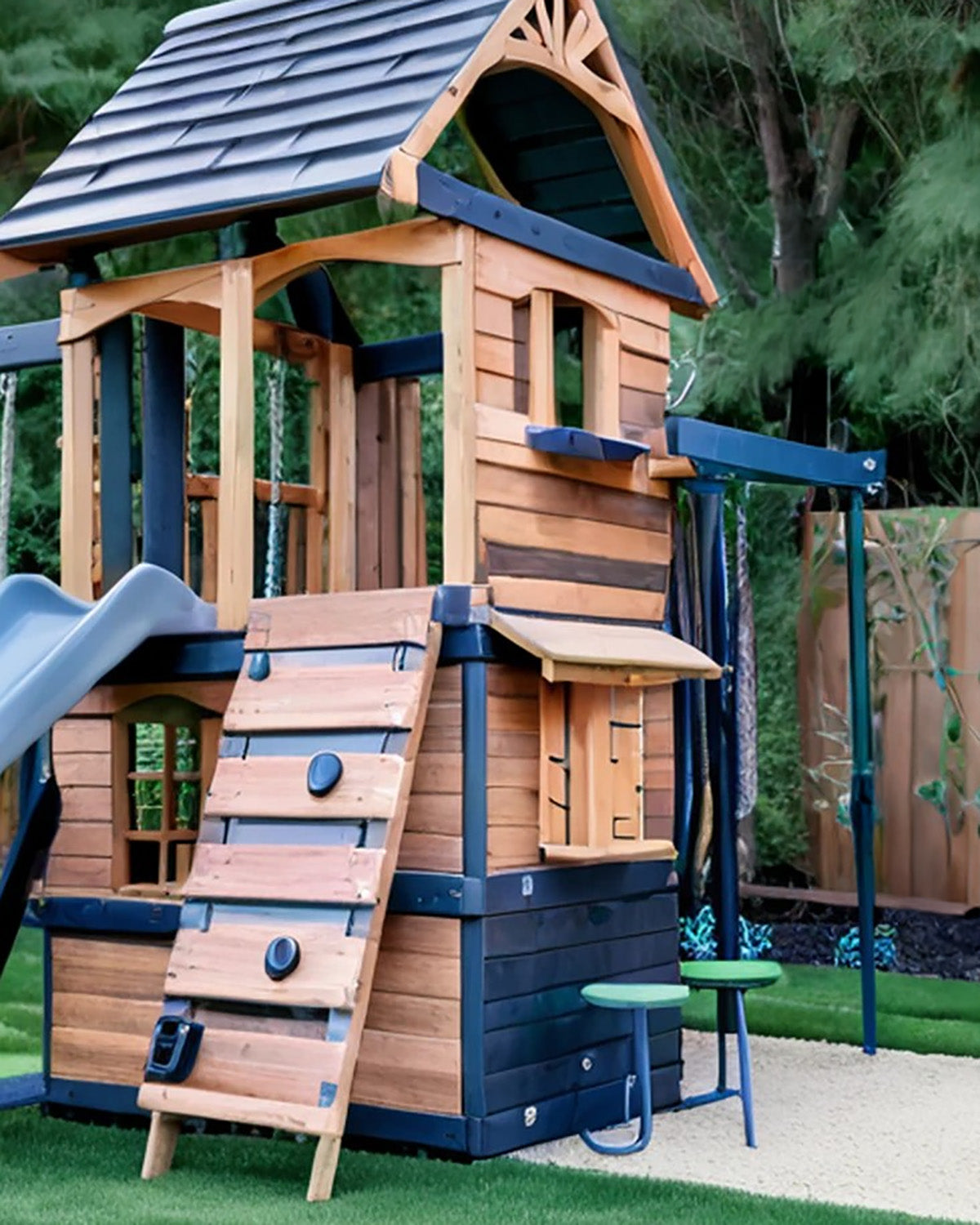 - Play Features: Wave slide, 2 swings, climbing wall, snack stand with stool, clubhouse