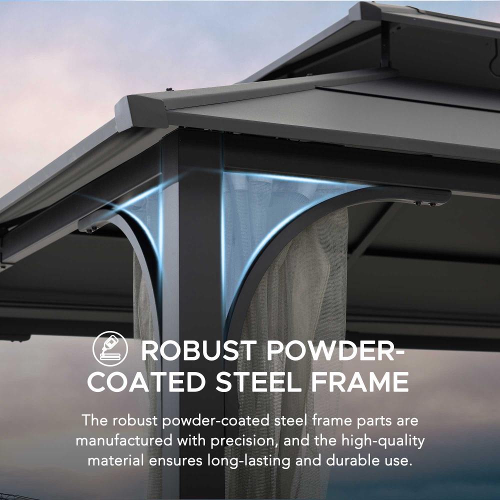 Contemporary gazebo with a gray steel roof and sheer curtains, ideal for backyard patios, garden lounges, and stylish outdoor living.