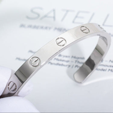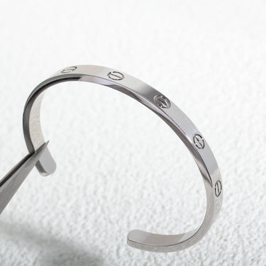 The 6.1 mm open cuff features engraved screw-motif detailing, offering a clean, minimalist silhouette designed for easy wear and all-day comfort.