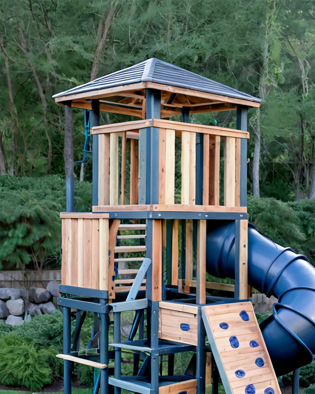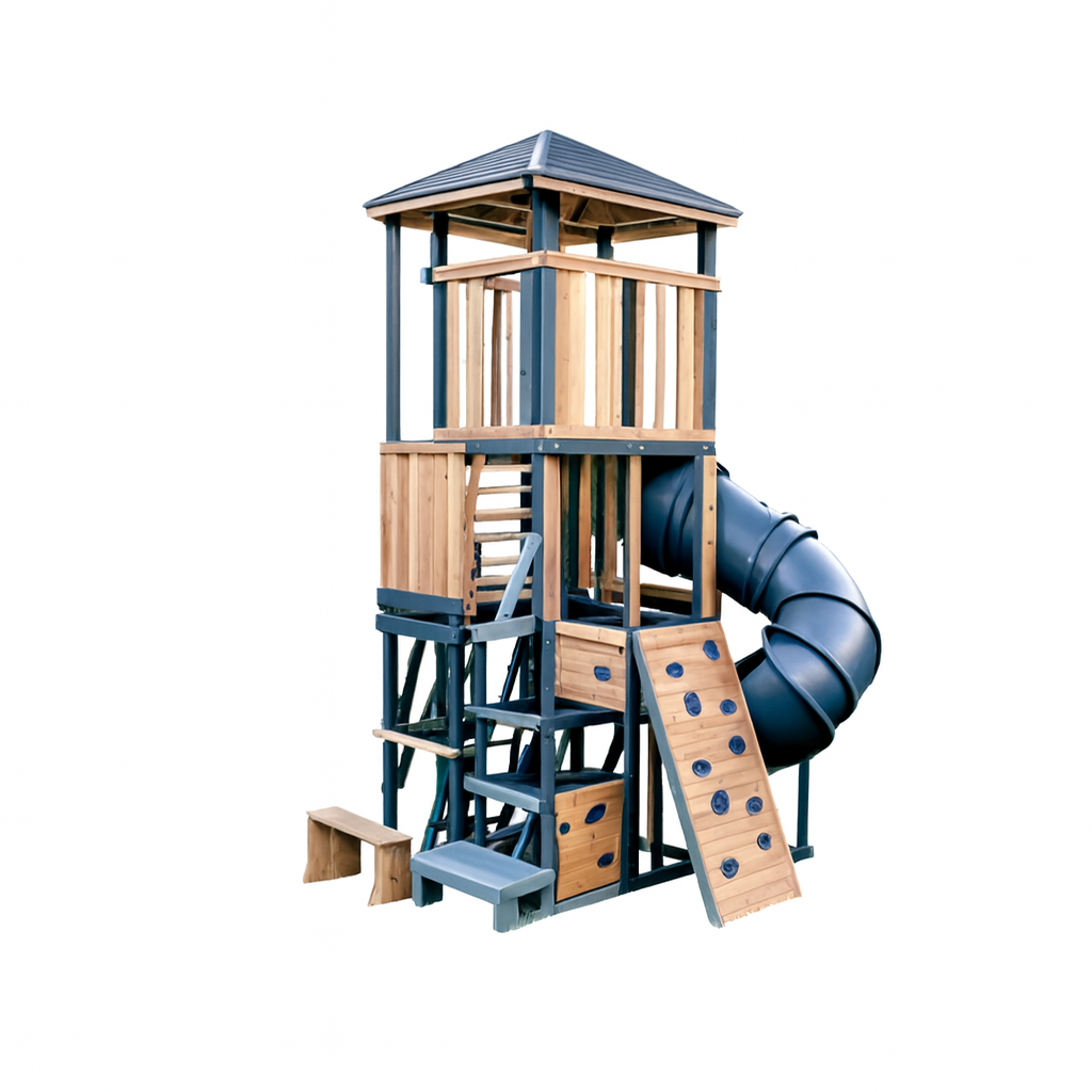 Modern Tower Outdoor Playset – Multi-Level Climbing Fort with Tube Slide