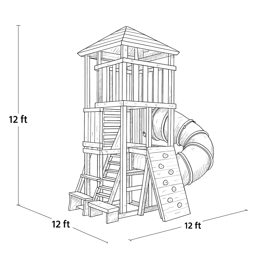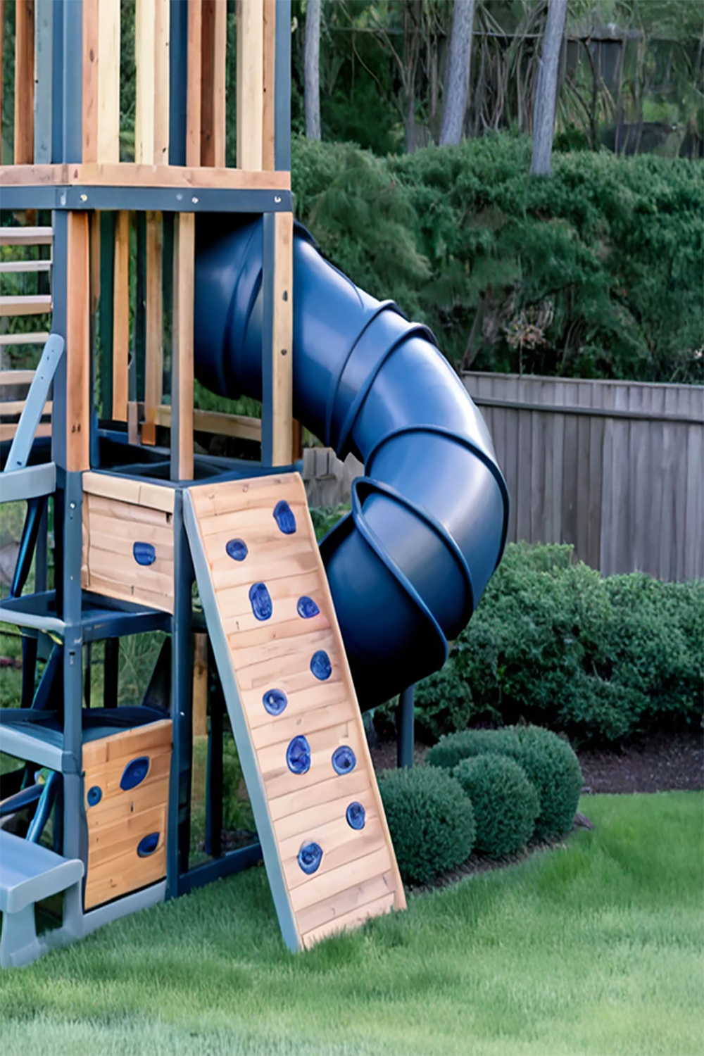 • Play Features: Tube slide, climbing walls, rope ladder, multi-level tower, activity bench