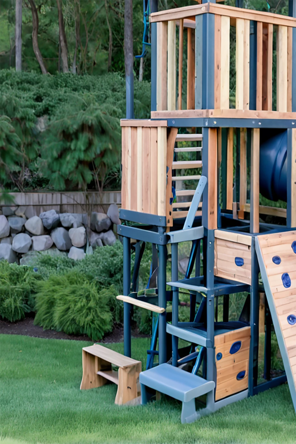 This modern tower climbing fort is a standout addition to any backyard—perfect for adventurous kids and stylish outdoor spaces.
