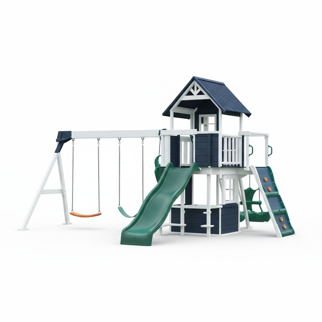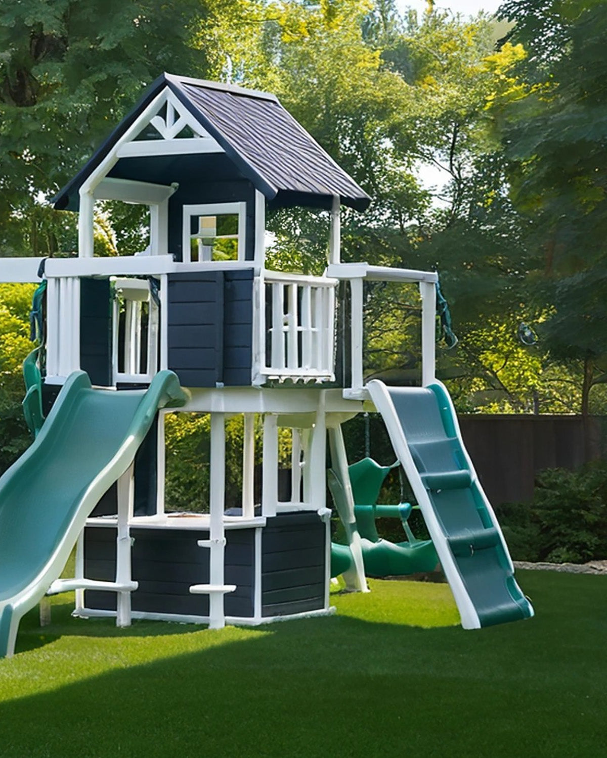 Modern Two-Tone Backyard Playset – Dual Slides, Swings & Clubhouse