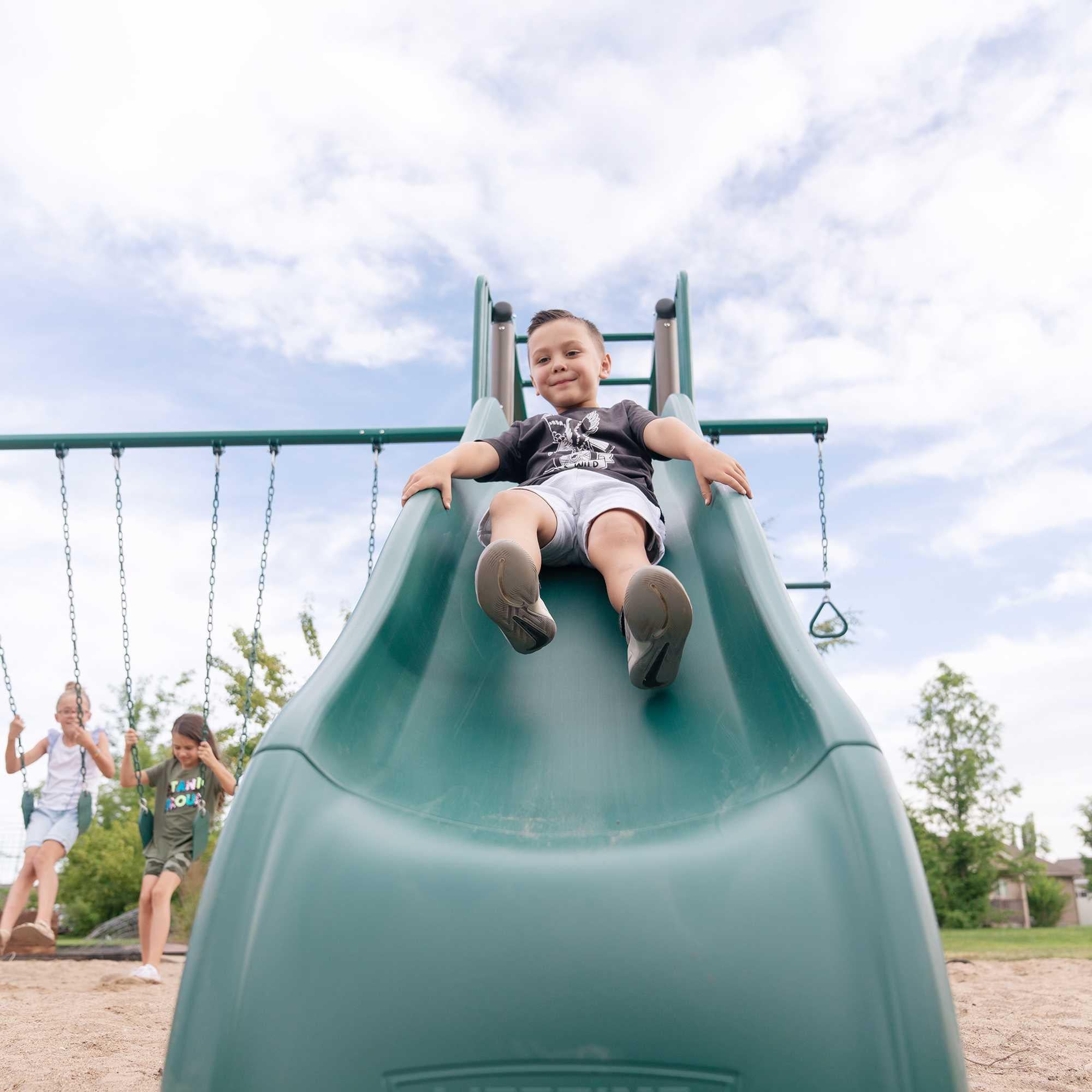 Our playsets are built from sustainably sourced cedar wood. We also make almost all our slides here in the US with 100% recyclable plastic. We gather all the plastic scraps and any defects from the slide formation process, and they are melted back into plastic sheets to be reused.