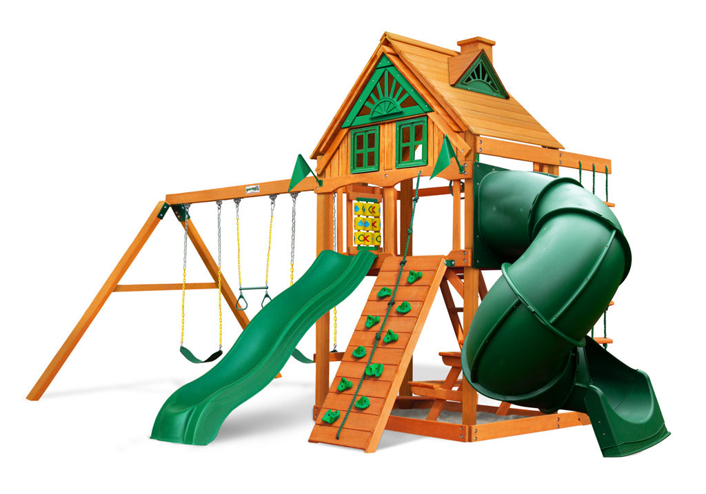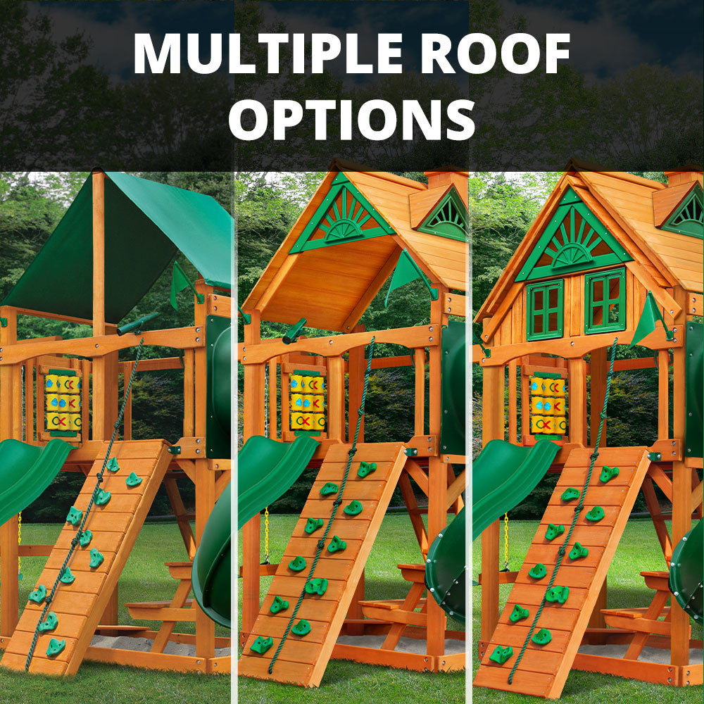 - Available with Standard Wood Roof (with sunbursts, dormers, and chimney), Green Vinyl Canopy, or Wood Roof with Treehouse Add-On