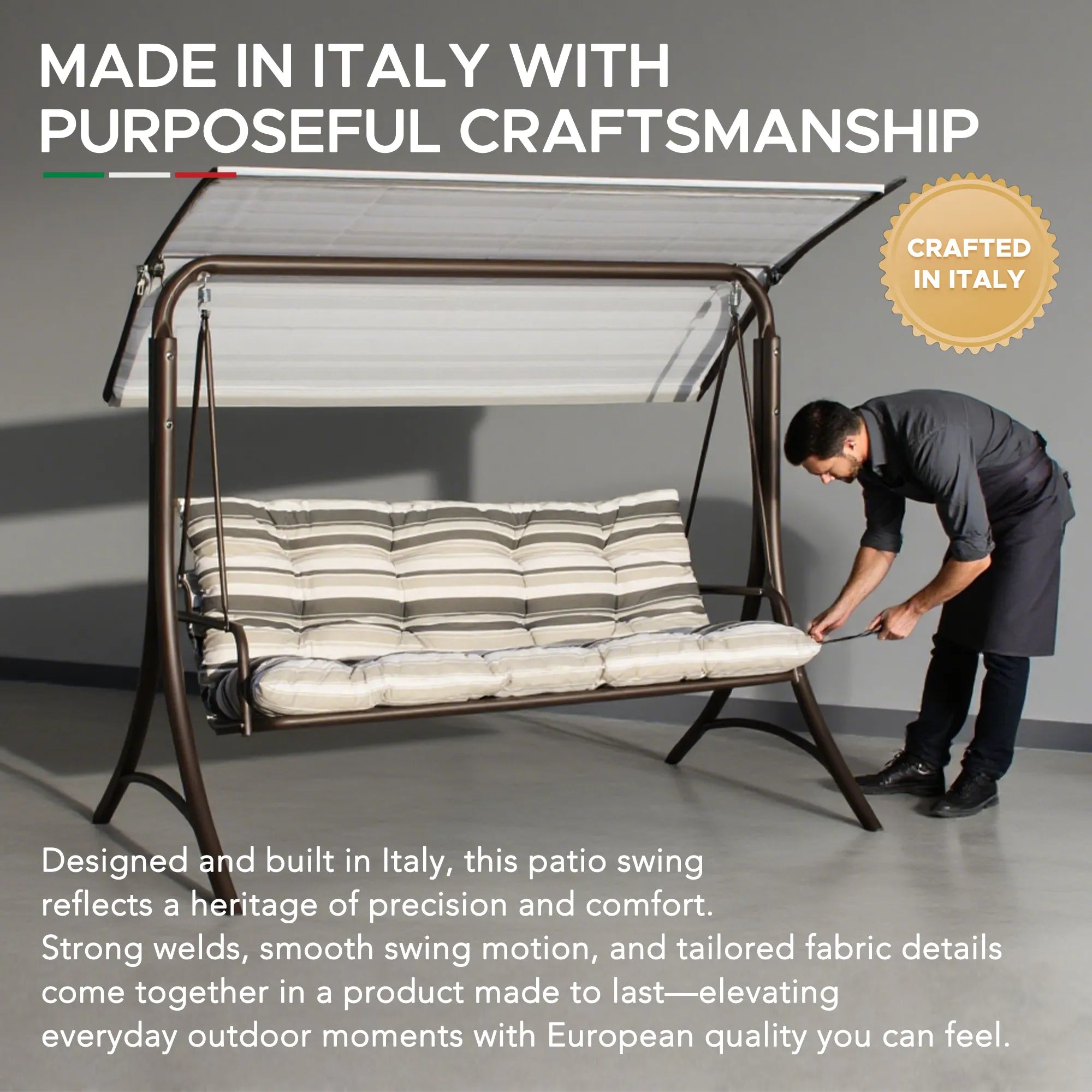 Stylish outdoor swing with striped cushions and adjustable canopy, comfortably seating three people for relaxing moments in the garden or patio.
