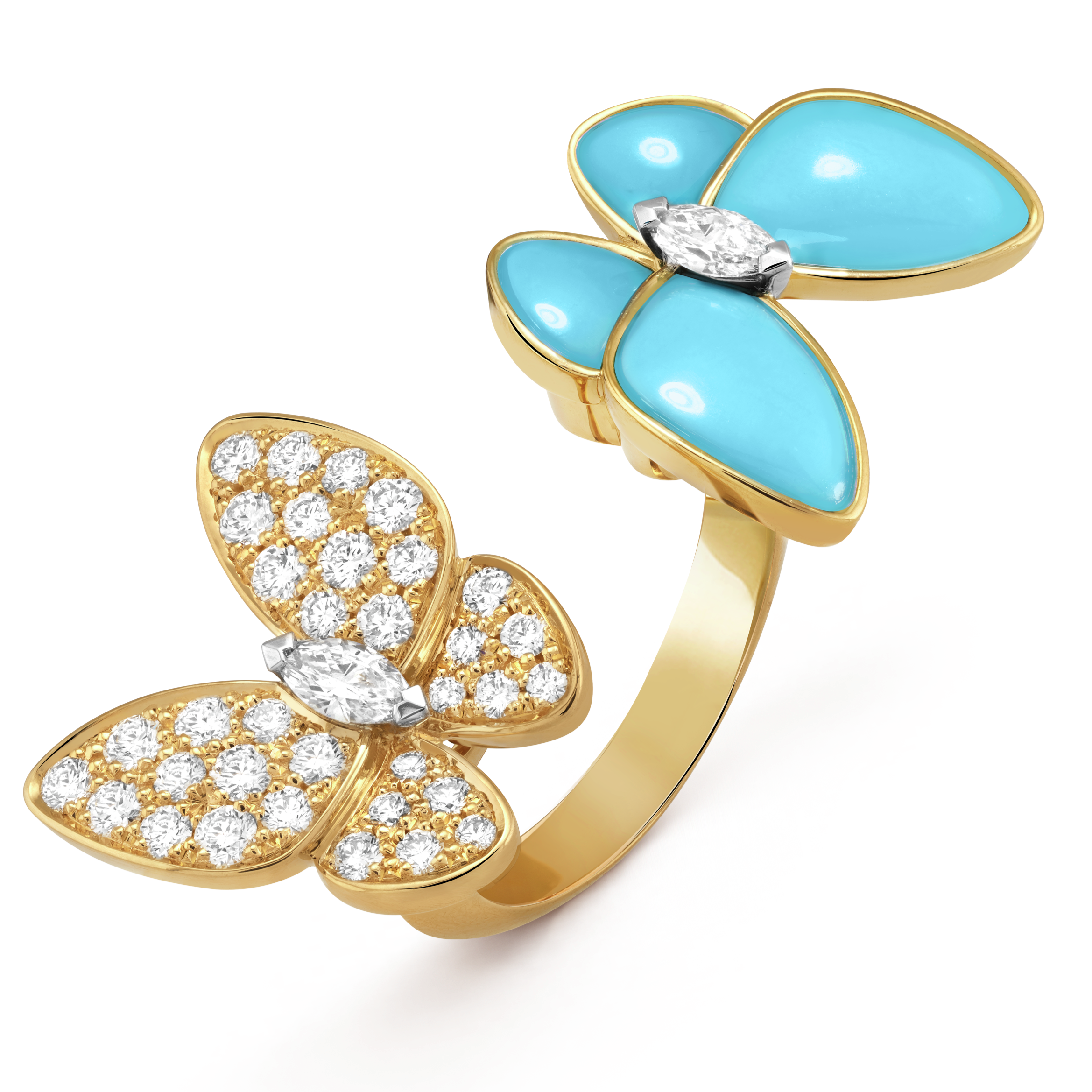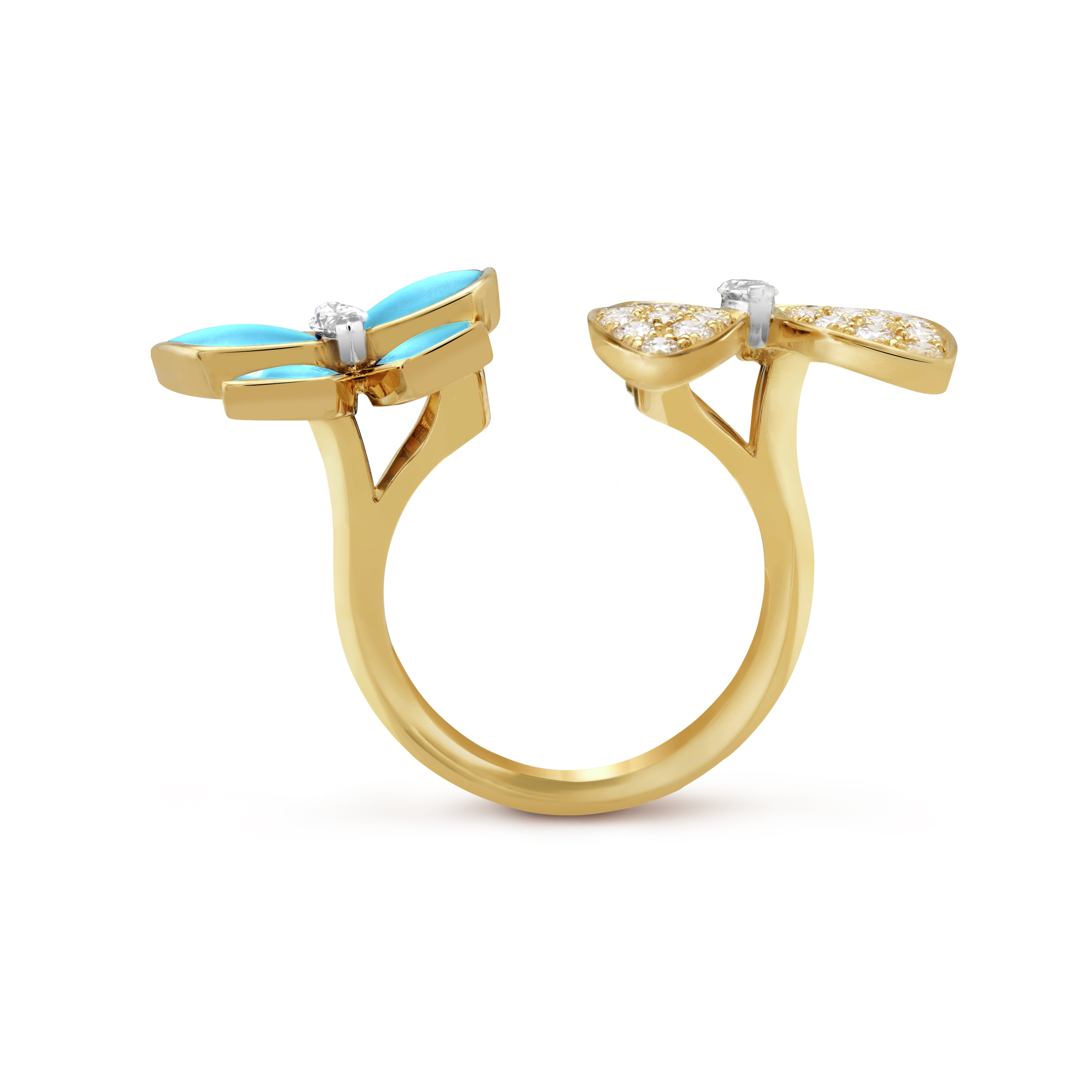 Elevate your jewelry collection with the Pnstime Two Butterfly Between the Finger Turquoise Ring, expertly crafted to combine artistry and durability. This exquisite piece showcases two intricately designed butterflies positioned elegantly between the fingers, each adorned with vibrant turquoise stones that bring a refreshing pop of color. The ring’s 18K yellow gold vermeil finish, applied over a solid 925 sterling silver core, ensures both a luxurious appearance and long-lasting wear resistant to tarnish. Featuring a 3mm band and an adjustable size range from US 5 to 10, it offers a comfortable, secure fit tailored for daily use or special occasions. The pavé-set accents add subtle sparkle, enhancing the ring’s refined aesthetic without overwhelming its delicate design. Hypoallergenic and skin-friendly, this ring is an ideal gift choice or a sophisticated addition to your personal collection, embodying modern elegance with a timeless appeal.