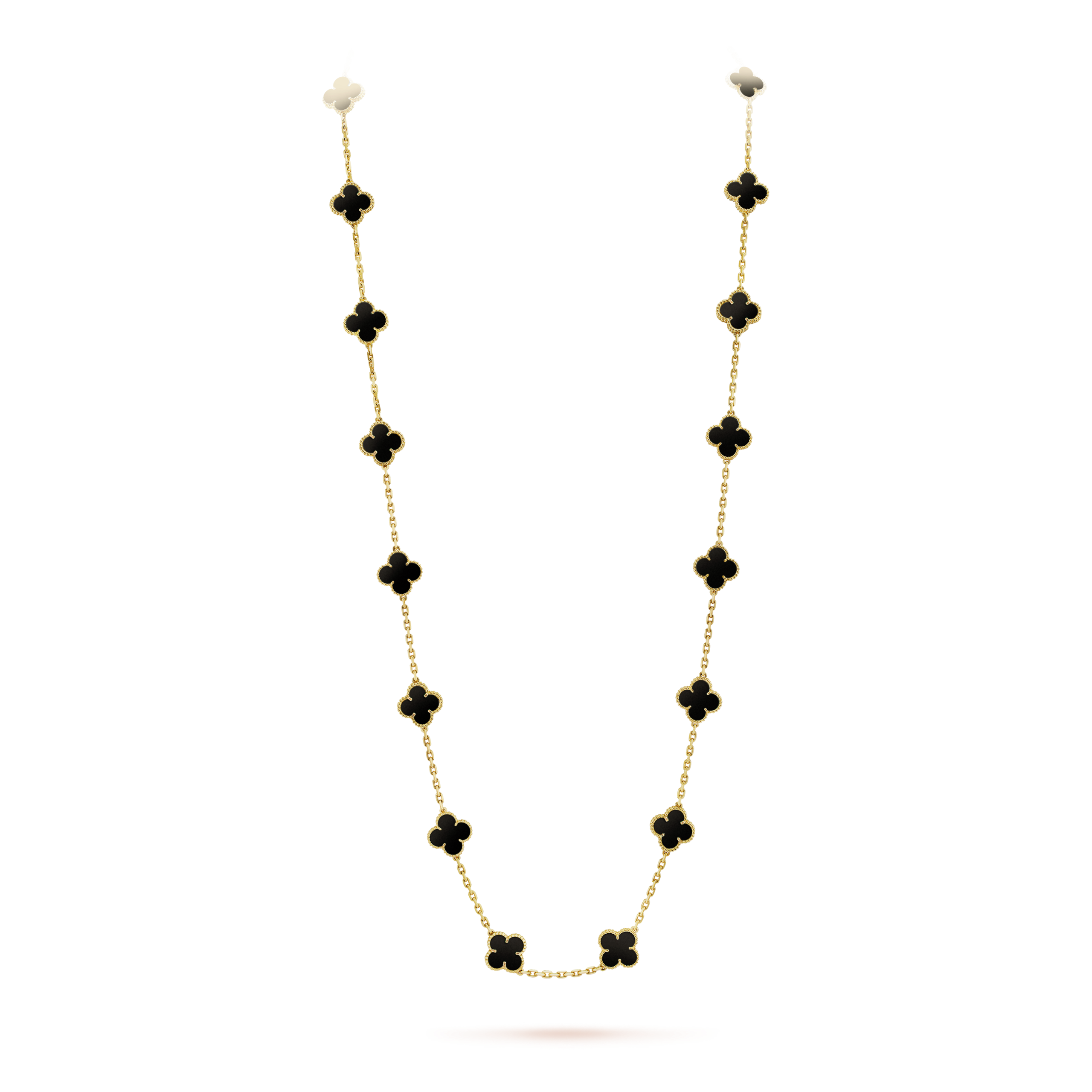 The Pnstime Vintage Alhambra Long Necklace features 20 onyx motifs set in 18K yellow gold, combining exquisite craftsmanship with premium materials. Measuring 86 cm, this delicate chain includes a hallmark clasp, showcasing a refined and timeless design ideal for sophisticated wear.