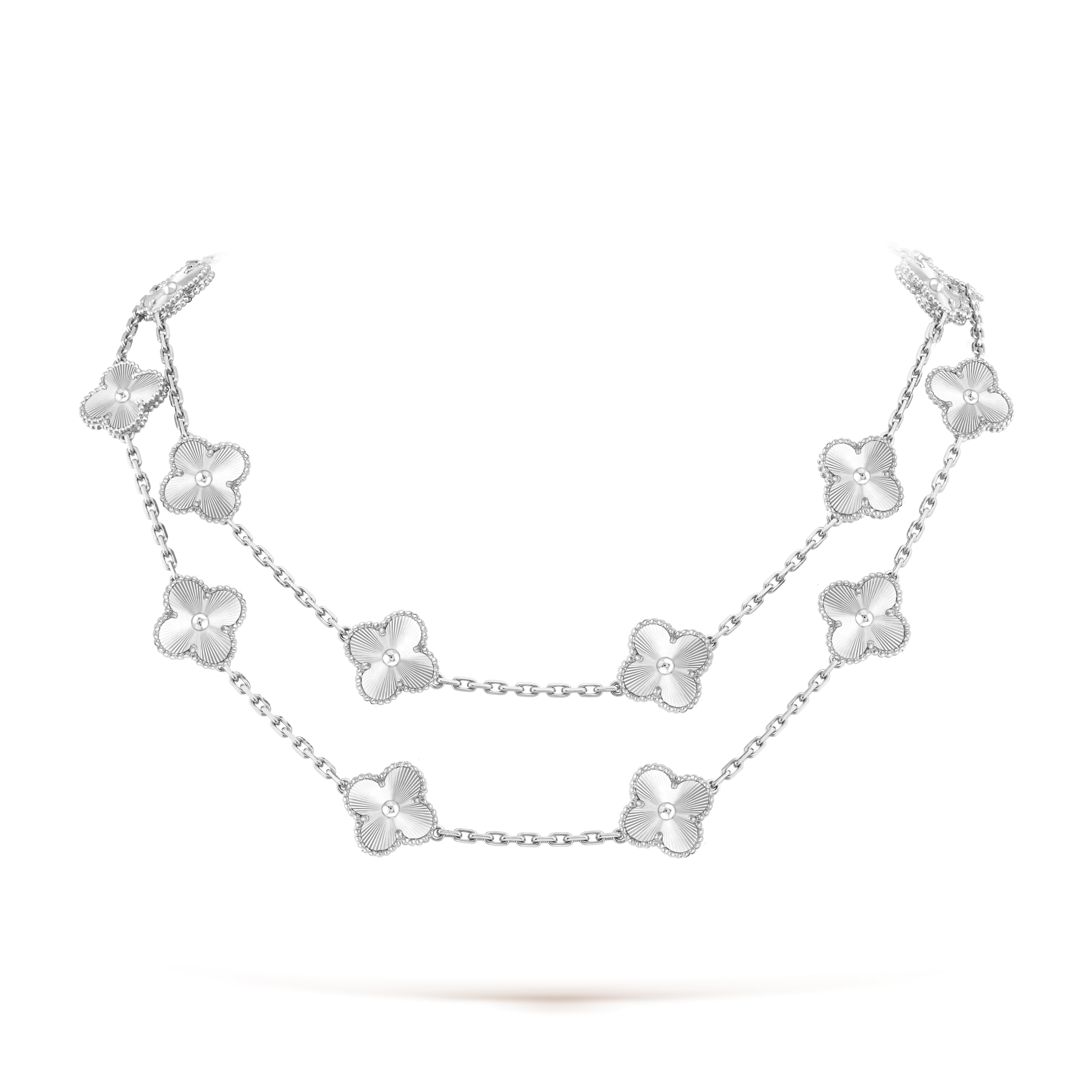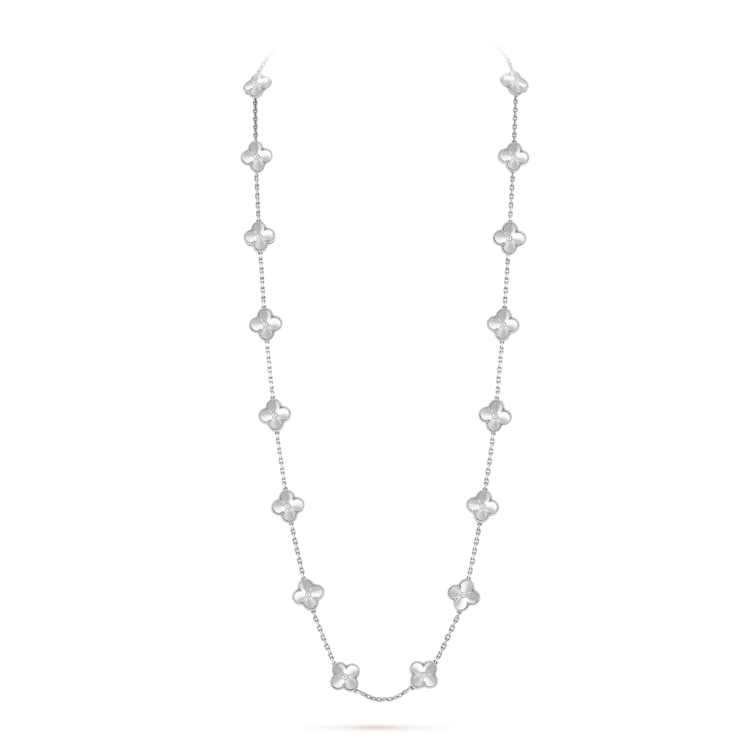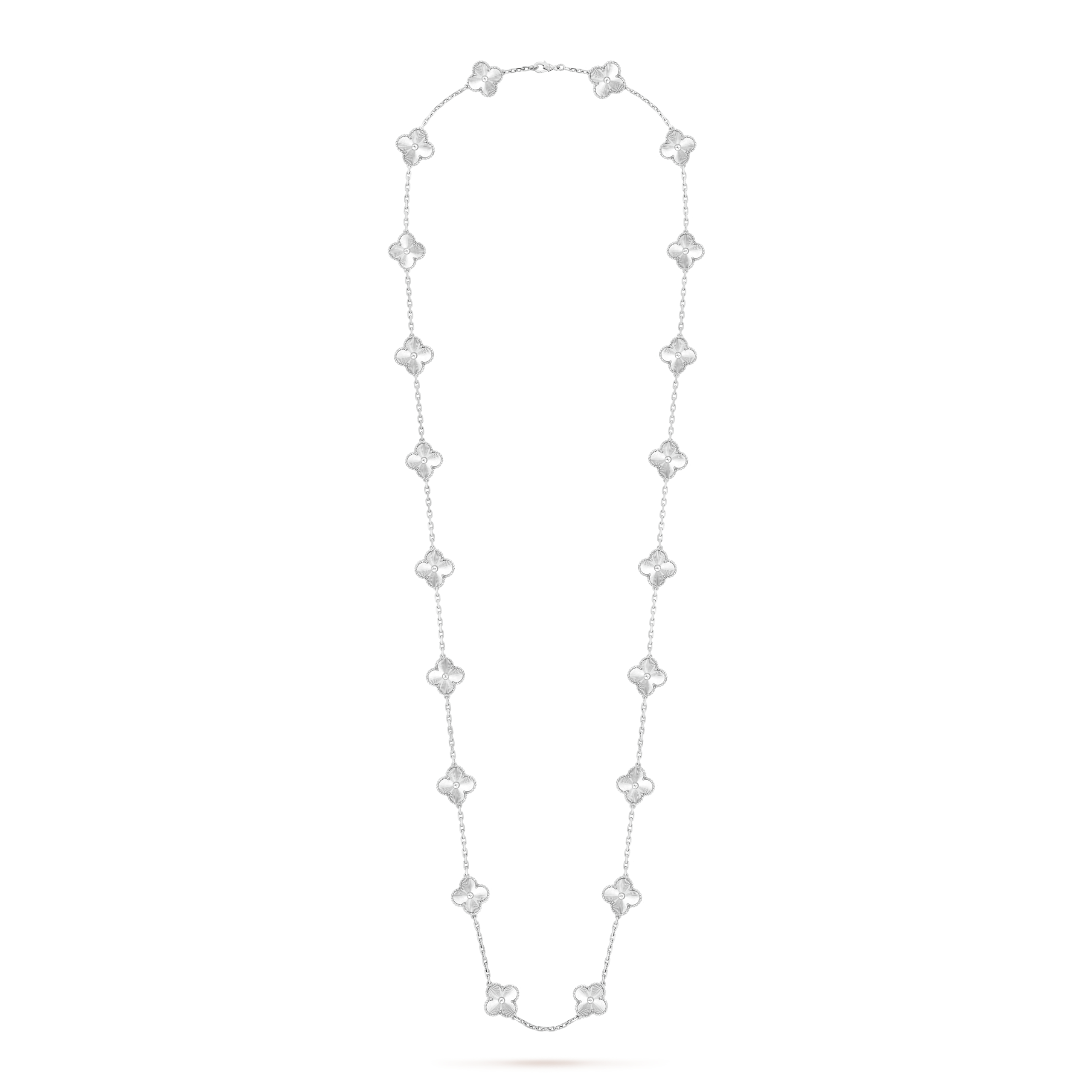 The Pnstime Vintage Alhambra Long Necklace features 20 agate motifs set in 18K gold, available in yellow, rose, or white gold. Measuring 86 cm, this expertly crafted piece combines a hallmark clasp with a refined chain, offering a sophisticated and enduring accessory for discerning collectors.