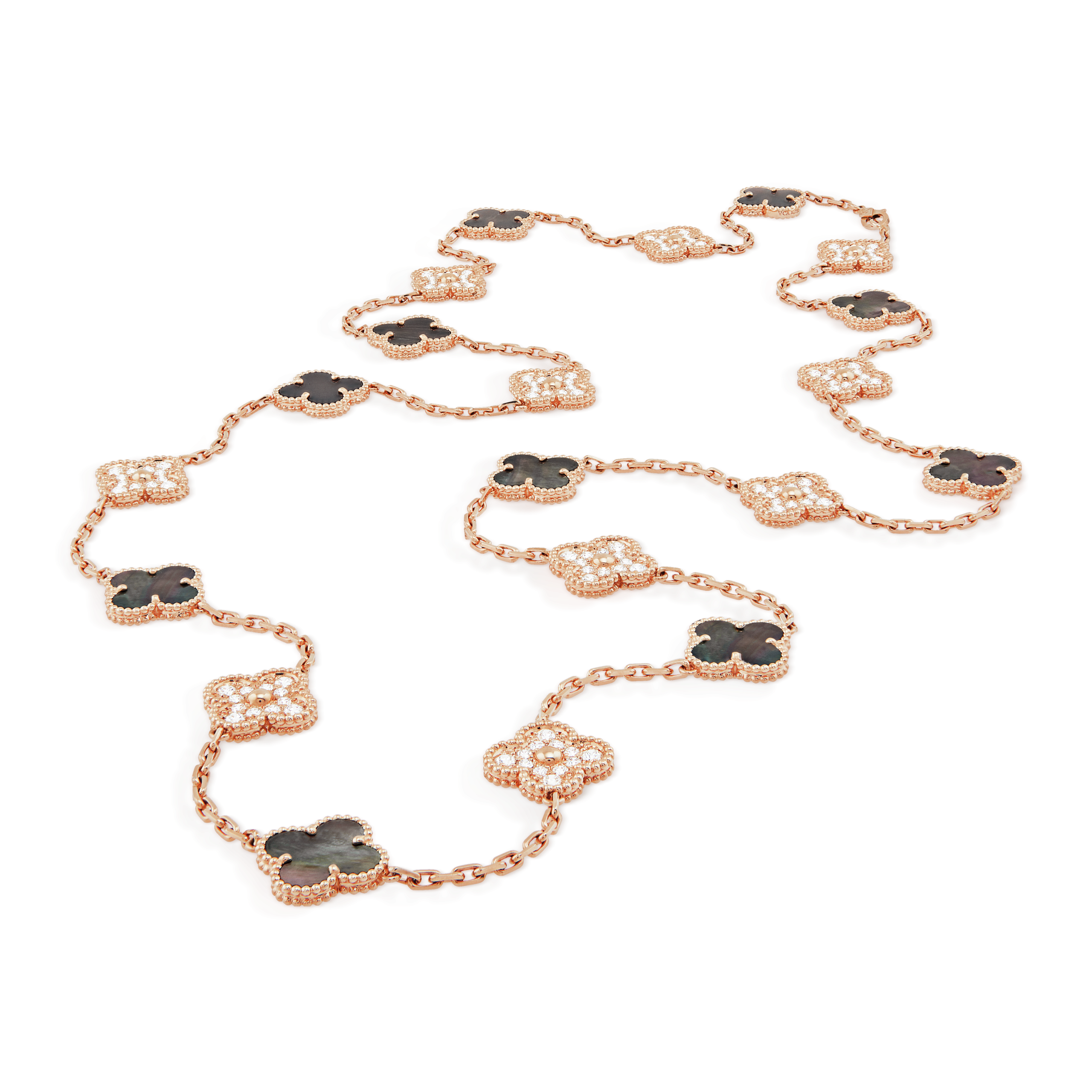 The Pnstime Vintage Alhambra Long Necklace features 20 motifs crafted in 18K rose gold, combining elegance with expert craftsmanship. Measuring 86 cm in length, it showcases a total of 4.83 carats of moissanite, complemented by diamond accents and 20 onyx stones. The necklace is secured with a hallmark clasp, offering a refined and timeless accessory for discerning collectors.