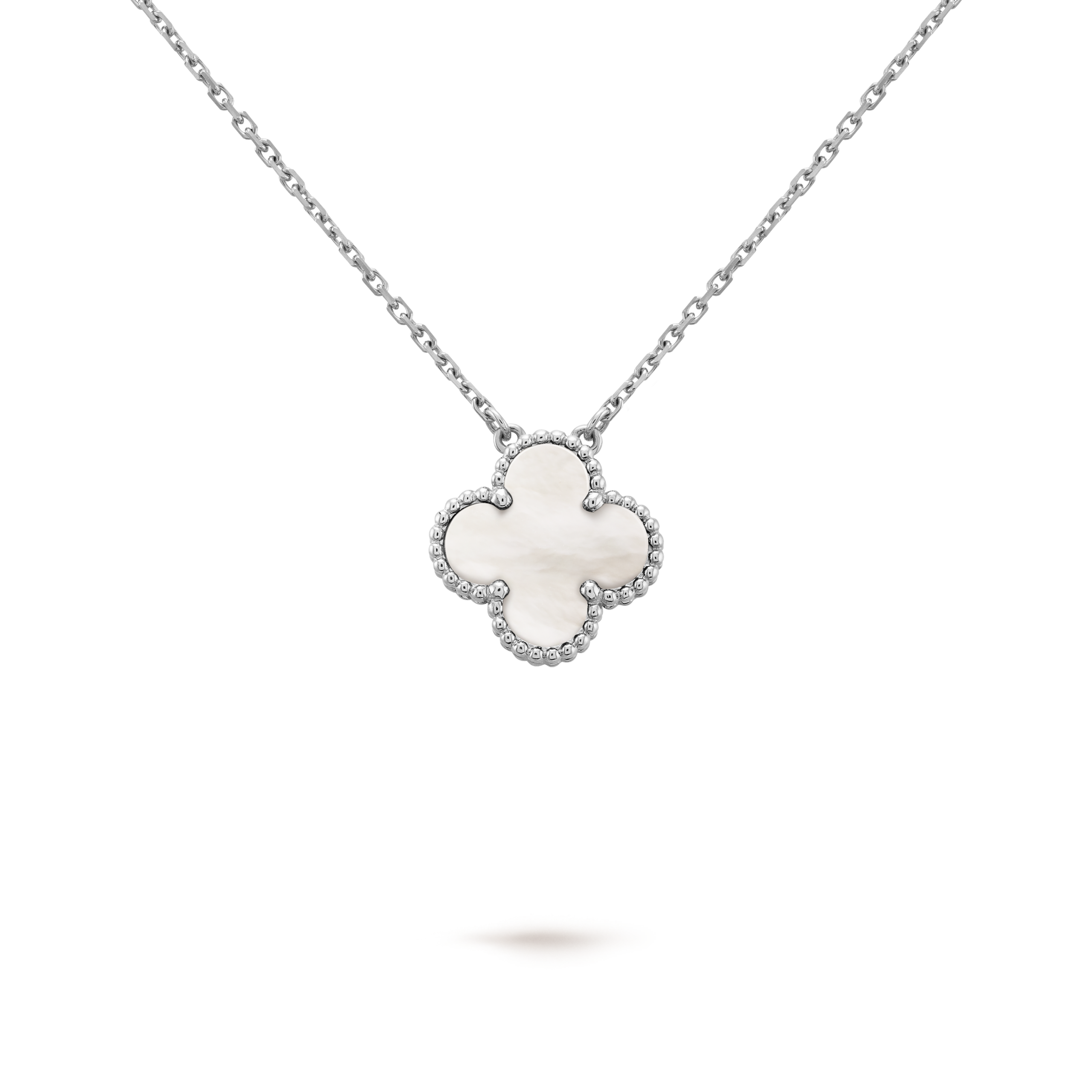 The Pnstime Vintage Alhambra Pendant Clover Necklace in 18K Gold features a distinctive design crafted from premium precious metals. It includes a hallmark clasp and is available in a petite size, offered in 18K yellow or white gold accented with pearls. The necklace chain measures 42 cm, combining elegance with expert craftsmanship.
