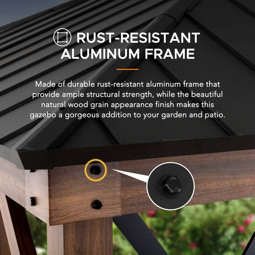 Upgrade your outdoor space with this rectangular hardtop gazebo, featuring a sturdy steel roof and elegant X-frame wood-look posts. The modern design combines durability with natural aesthetics, offering reliable protection from sun, wind, and rain. With spacious coverage, it is perfect for outdoor dining, lounging, or entertaining guests.