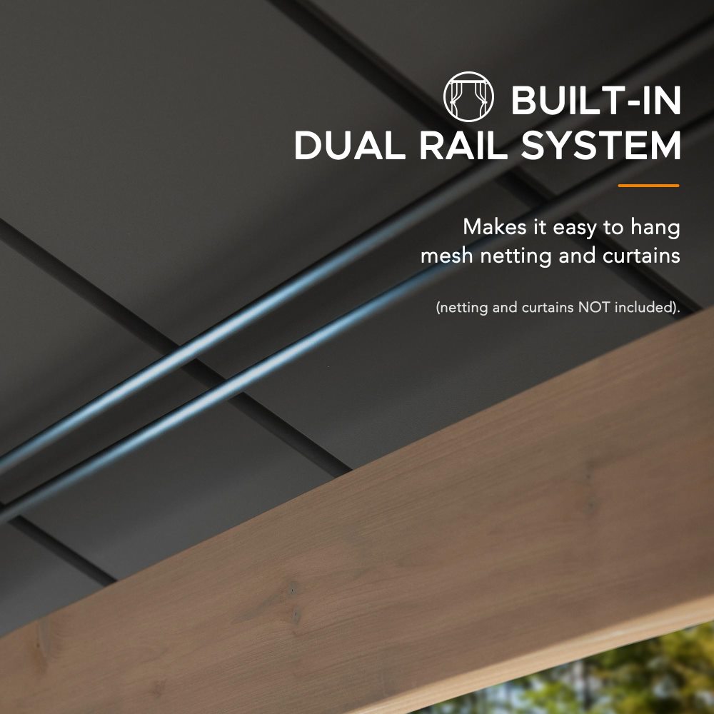 Modern rectangular gazebo with steel hardtop roof and wood-look frame, offering shade and elegance for backyard, garden, or poolside living.