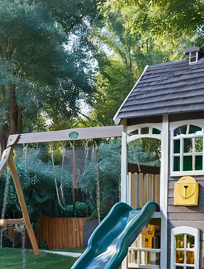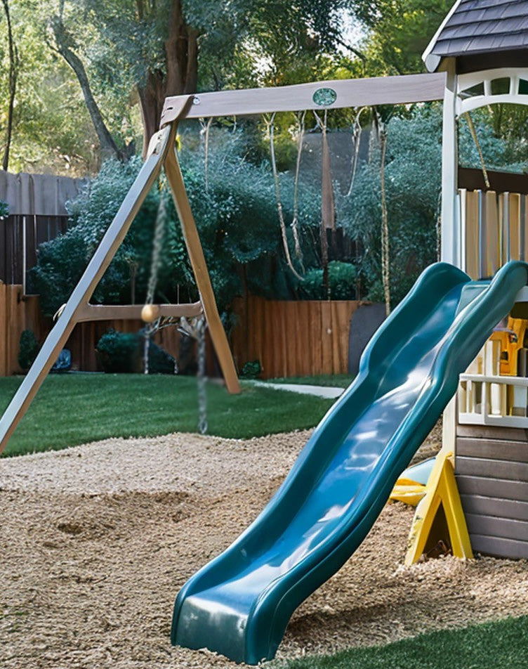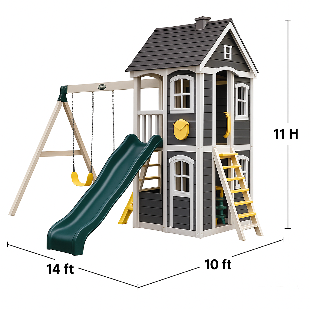 - Play Features: Tower playhouse, wave slide, 2 swings, climbing ladder, role-play details