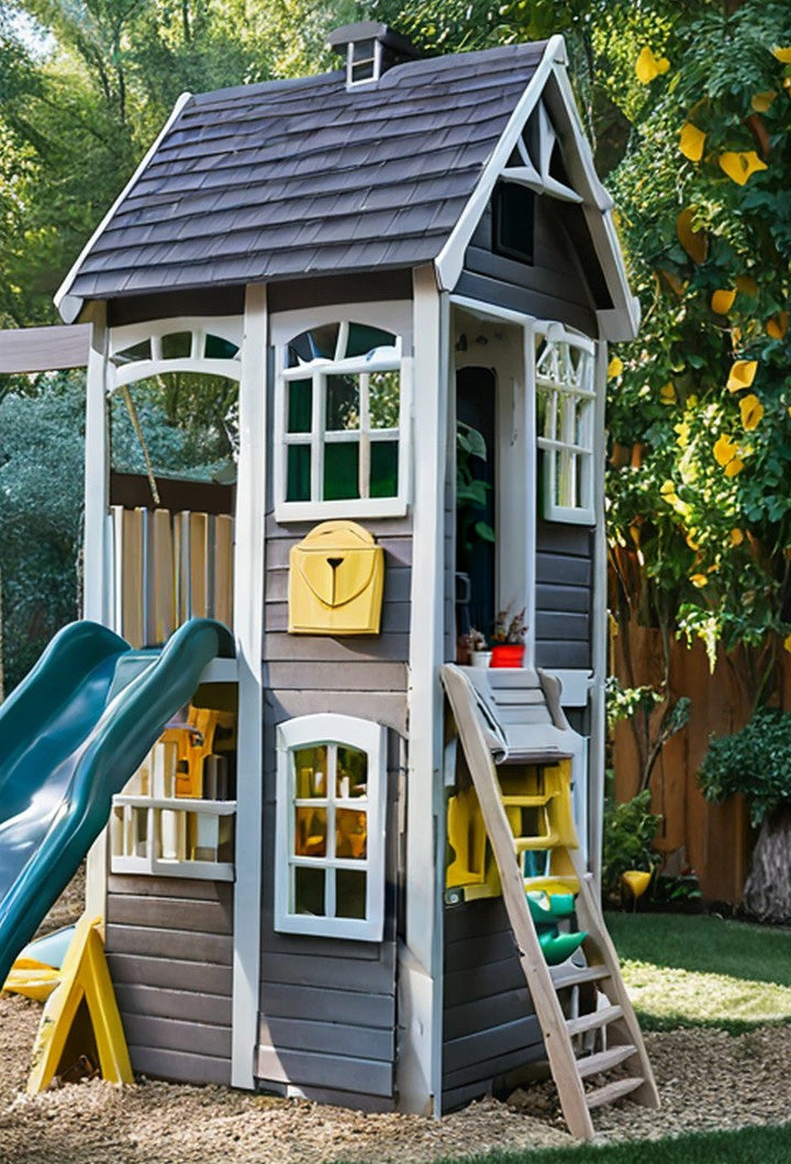 - Whimsical Storybook Design: Cottage-inspired playhouse tower with windows and charming details.