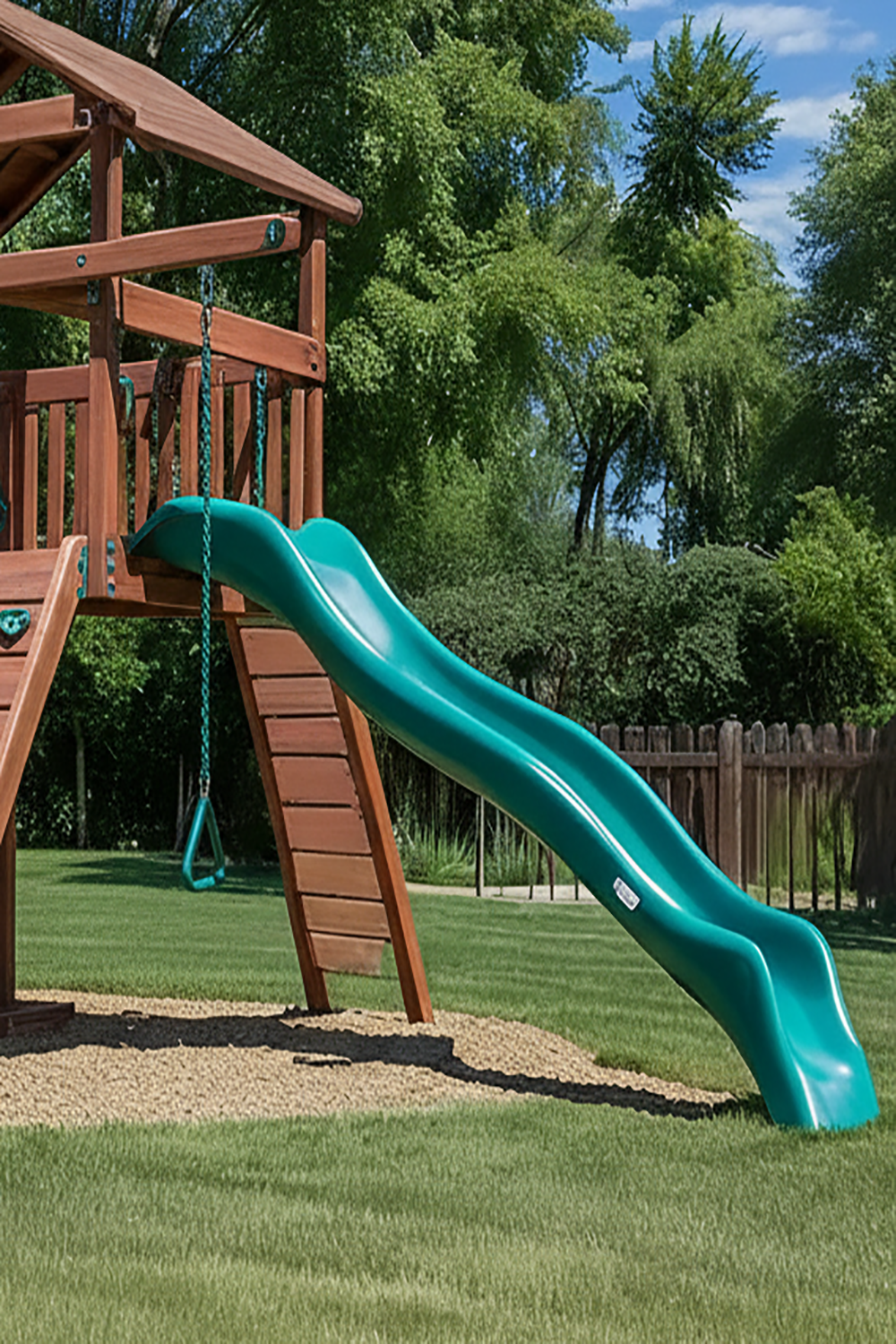 Our playsets are built from sustainably sourced cedar wood. We also make almost all our slides here in the US with 100% recyclable plastic. We gather all the plastic scraps and any defects from the slide formation process, and they are melted back into plastic sheets to be reused.