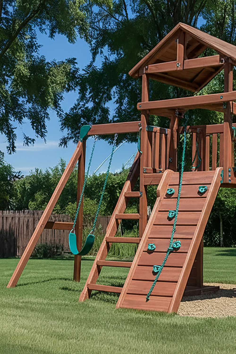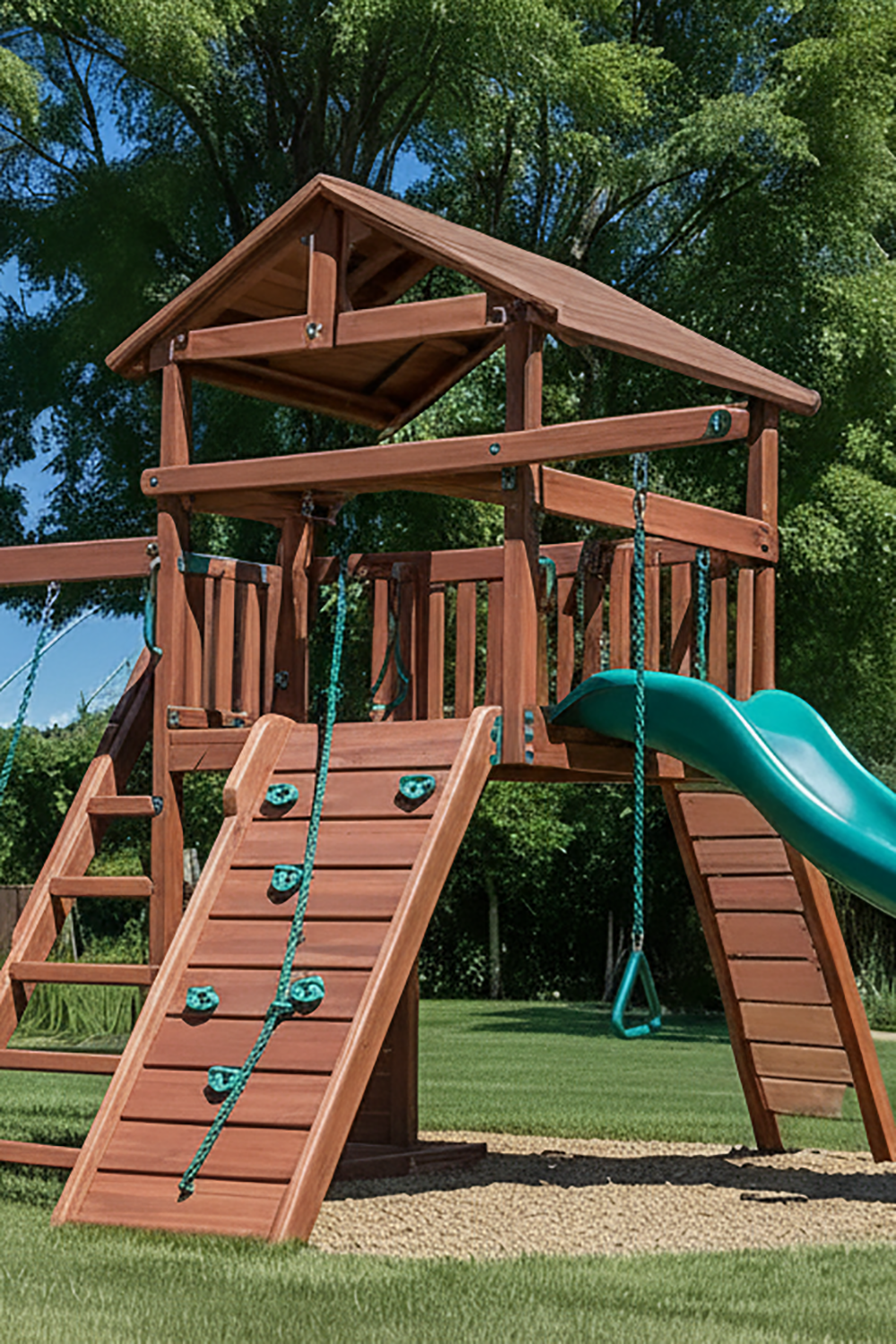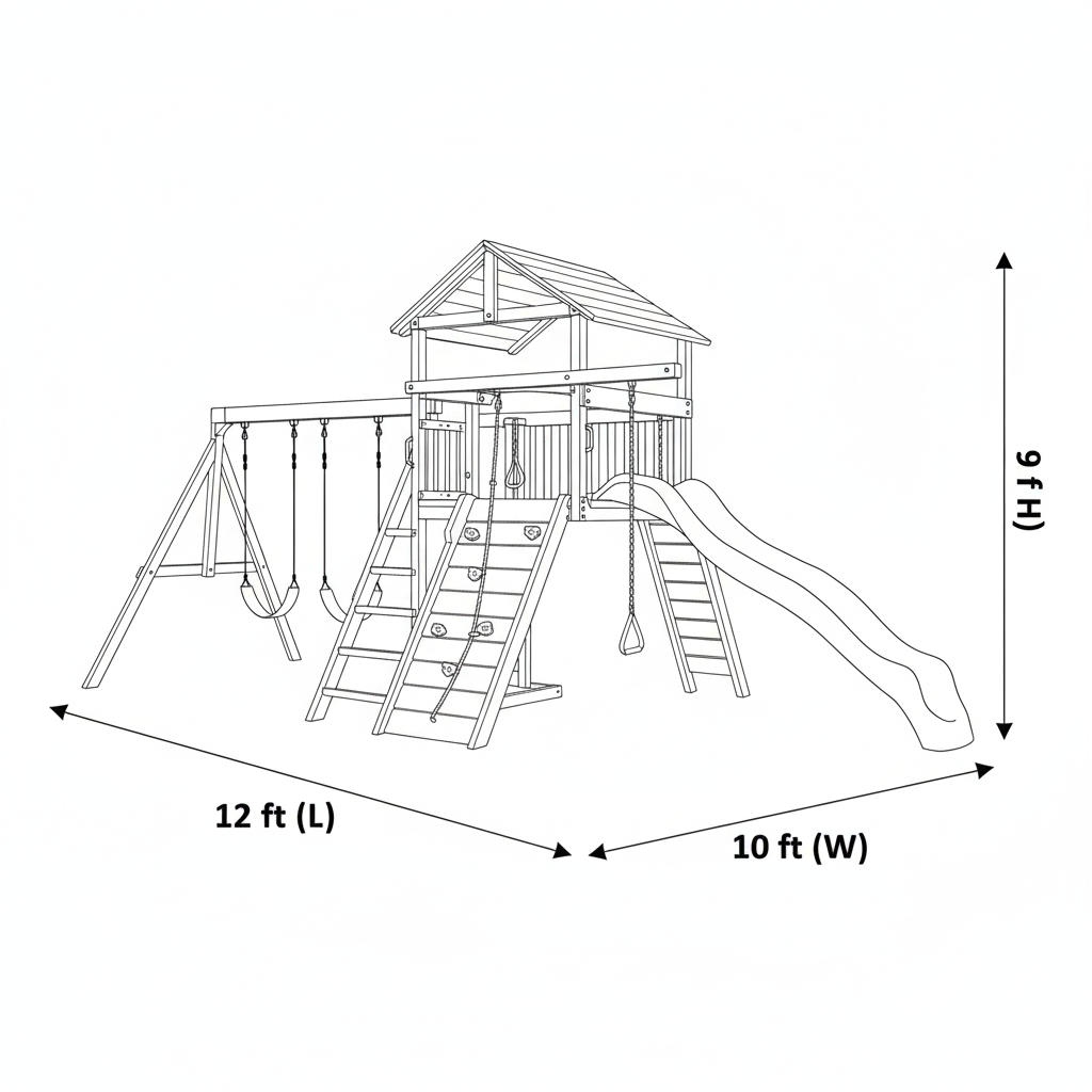 Turn your backyard into an adventure zone with the Summit Climber Wooden Playset. Built from durable, weather-resistant wood, this playground is designed to keep kids active, engaged, and full of joy. Featuring a spacious upper fort with a sturdy roof, kids can climb, slide, and explore in endless ways.