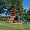 - Wooden tower fort with shaded play deck for imaginative adventures