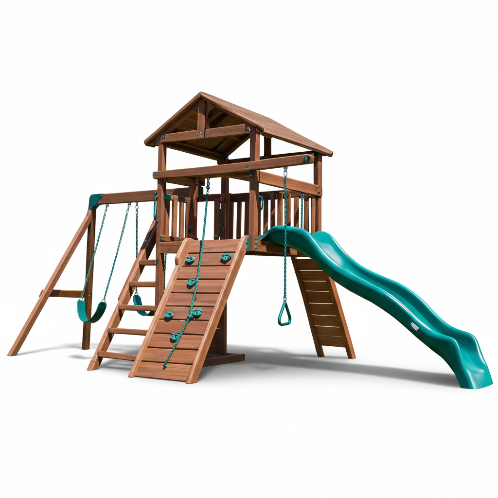 Summit Climber Wooden Playset – Outdoor Kids Playground with Slide, Rope Wall & Tower