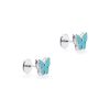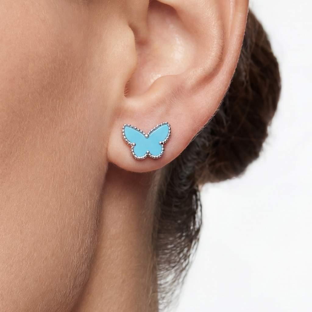 Each stud features a turquoise-hued inlay, artfully set within softly curved wings that measure 10.5 mm by 8 mm. Designed for lightweight comfort and versatile styling, they bring a joyful accent to daytime ensembles and a refined touch to evening wear.