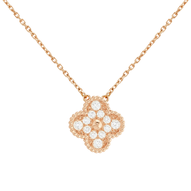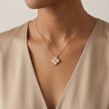 The Sweet Alhambra Necklace features a delicate four-leaf clover pendant—a timeless symbol of harmony and grace. Crafted from 18K rose gold vermeil over a durable 925 sterling silver base, it blends refined charm with lasting style.
