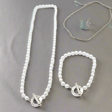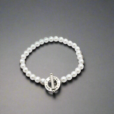 Designed with luminous pearl beads and a classic toggle clasp, this bracelet offers a secure yet graceful fit. Available in 17 cm and 19 cm lengths.