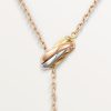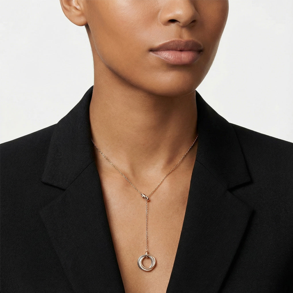 Expertly crafted from 925 sterling silver and finished in 18K gold vermeil, it features three interlocking rings in yellow, rose, and white gold tones—representing unity and eternity. One ring is delicately pavé-set with sparkling cubic zirconia, adding a subtle touch of brilliance.